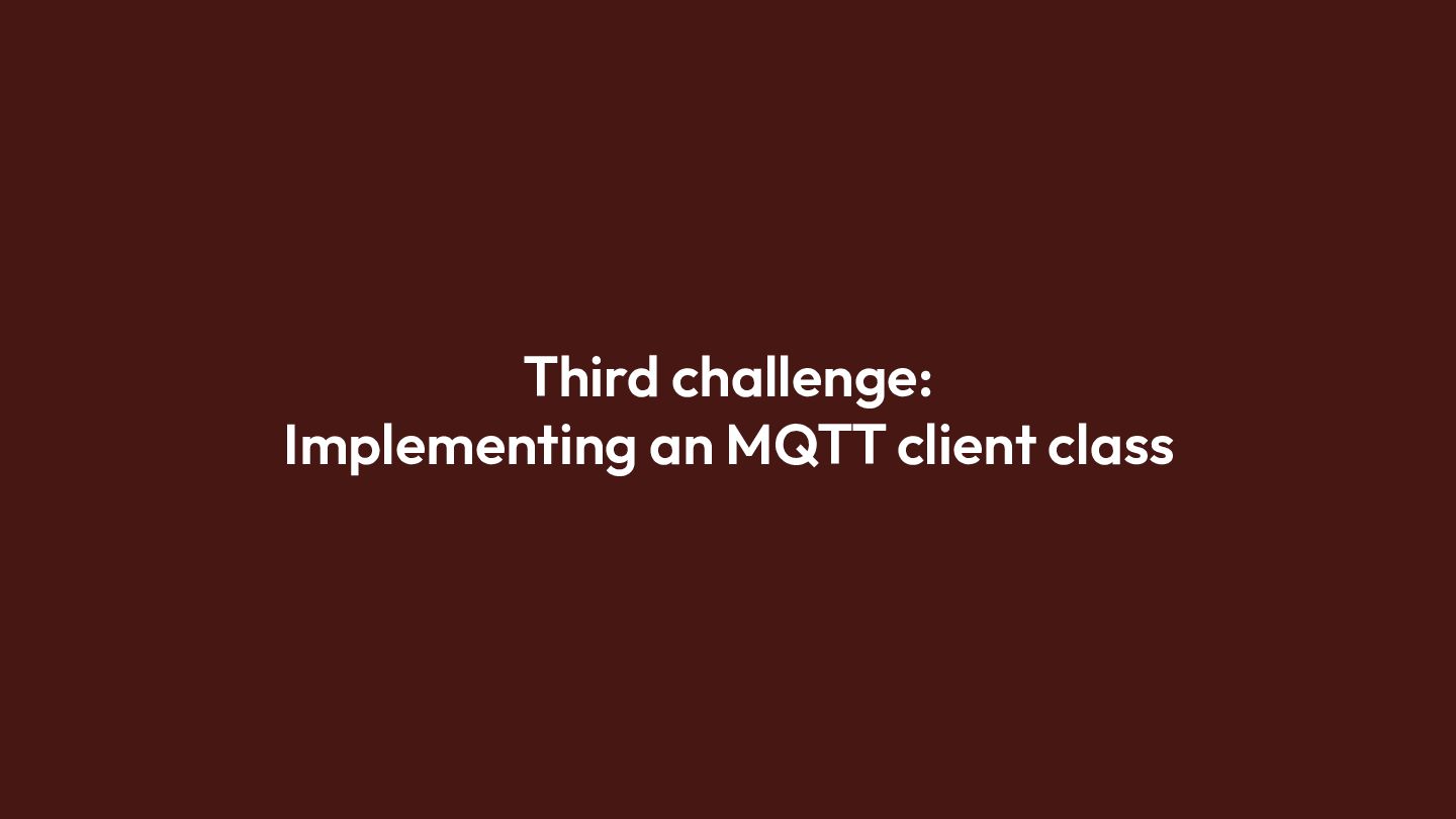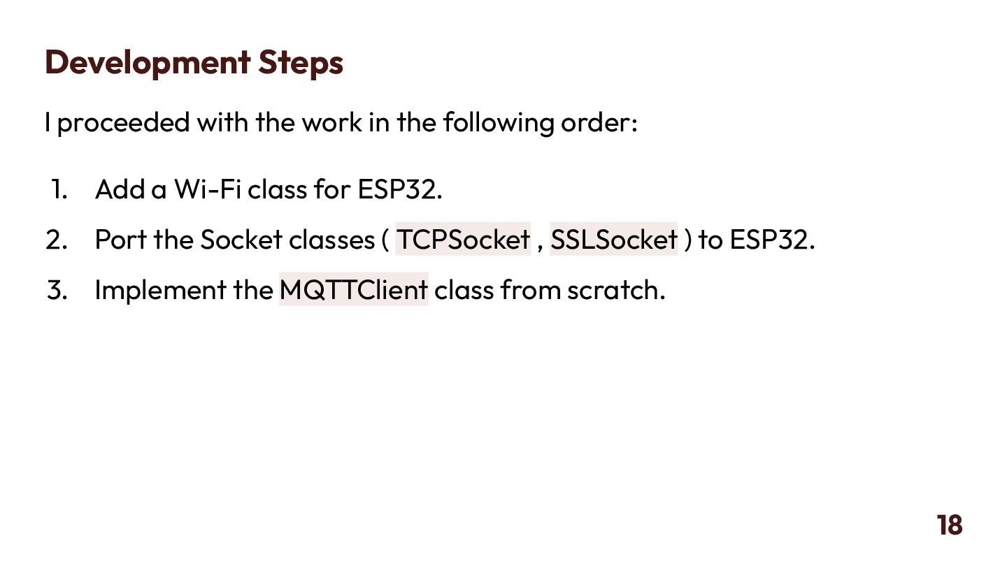 order: 1. Add a Wi-Fi class for ESP32. 2. Port the Socket classes ( TCPSocket , SSLSocket ) to ESP32. 3. Implement the MQTTClient class from scratch. 18