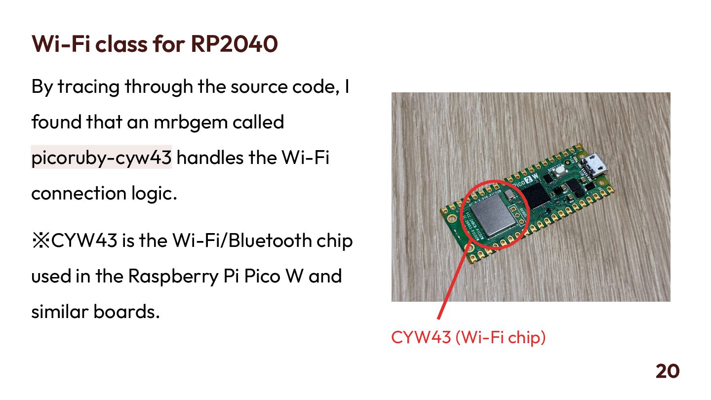 I found that an mrbgem called picoruby-cyw43 handles the Wi-Fi connection logic. ※CYW43 is the Wi-Fi/Bluetooth chip used in the Raspberry Pi Pico W and similar boards. 20 CYW43 (Wi-Fi chip)