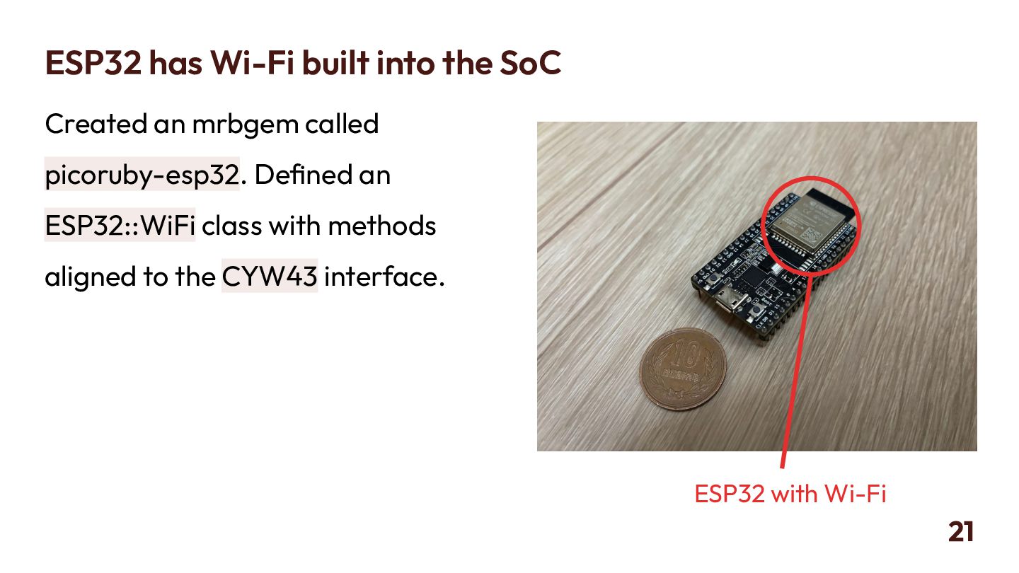 called picoruby-esp32. Defined an ESP32::WiFi class with methods aligned to the CYW43 interface. 21 ESP32 with Wi-Fi