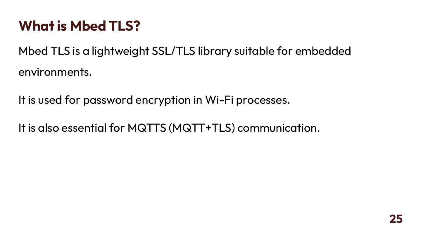 library suitable for embedded environments. It is used for password encryption in Wi-Fi processes. It is also essential for MQTTS (MQTT+TLS) communication. 25