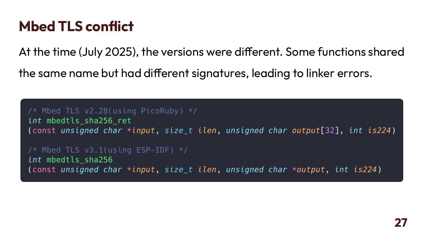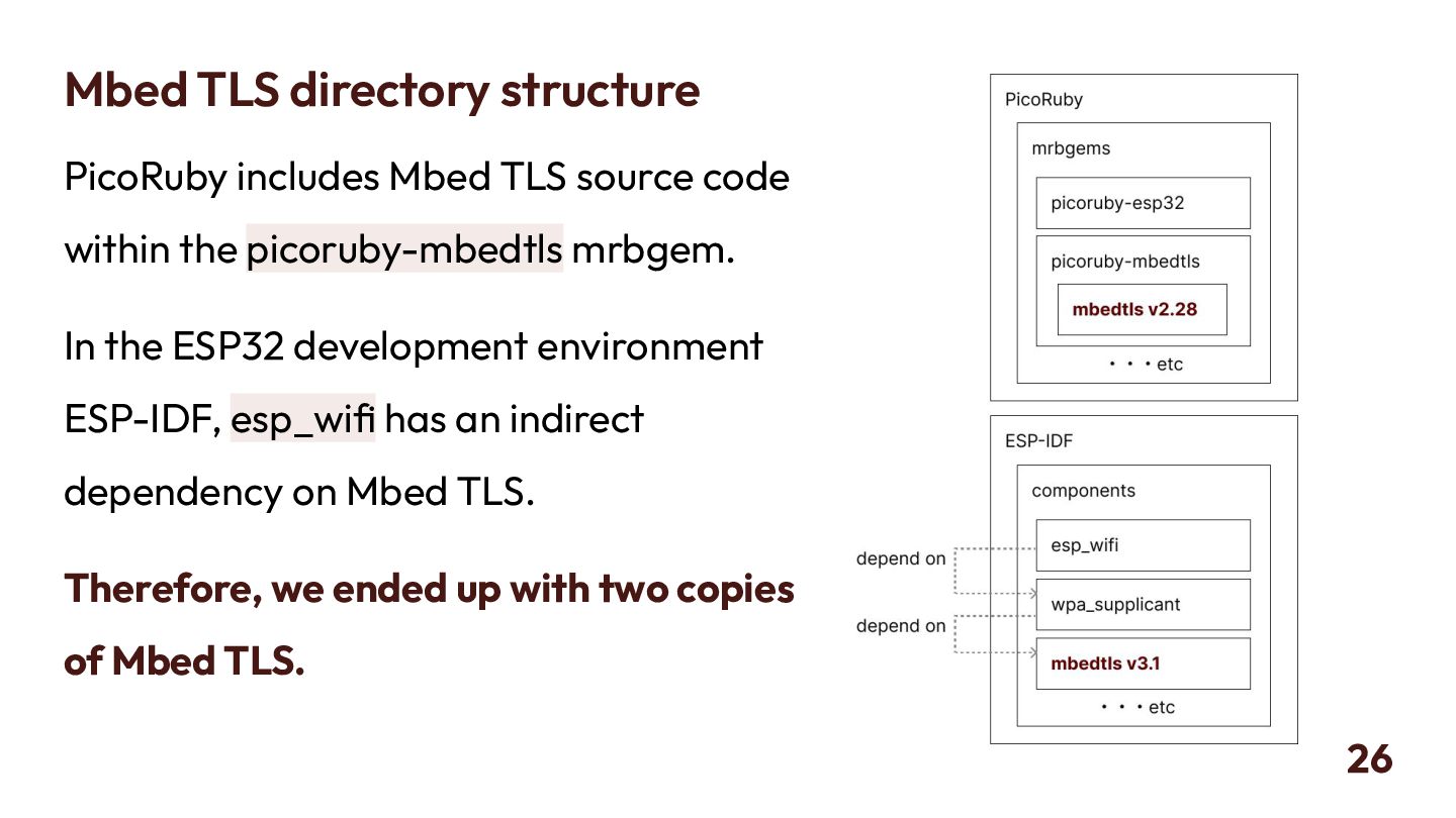 within the picoruby-mbedtls mrbgem. In the ESP32 development environment ESP-IDF, esp_wifi has an indirect dependency on Mbed TLS. Therefore, we ended up with two copies of Mbed TLS. 26