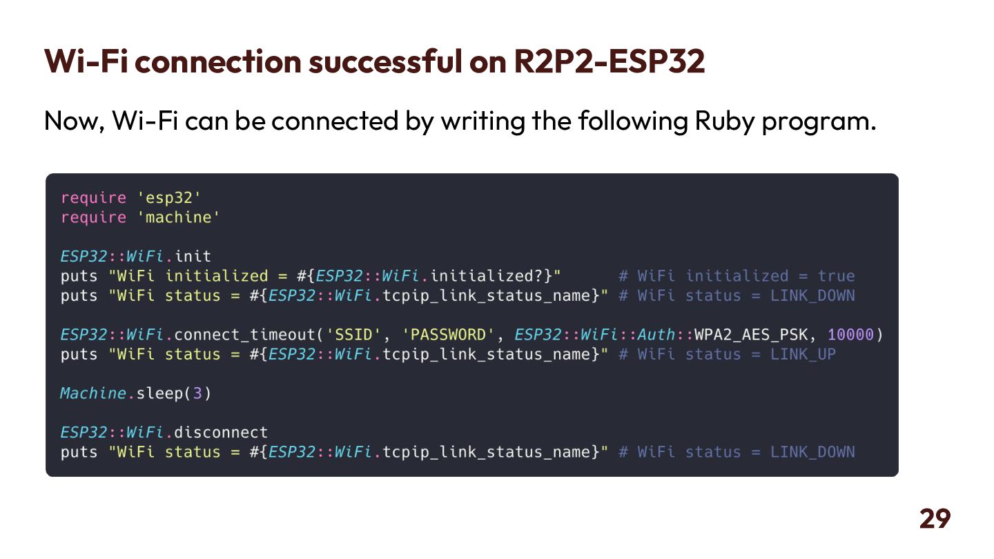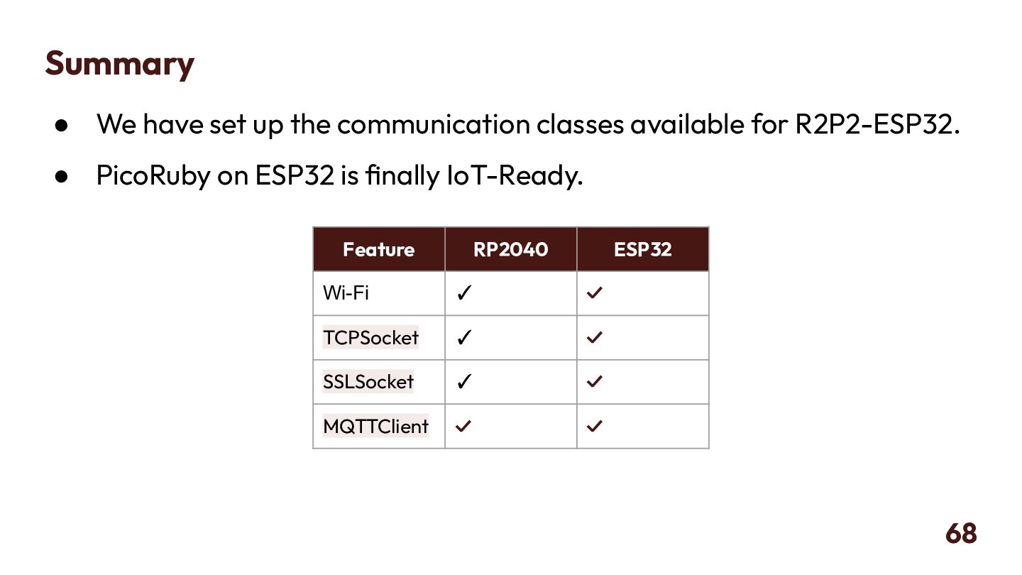 for R2P2-ESP32. • PicoRuby on ESP32 is finally IoT-Ready. 68 Feature RP2040 ESP32 Wi-Fi ✓ ✓ TCPSocket ✓ ✓ SSLSocket ✓ ✓ MQTTClient ✓ ✓
