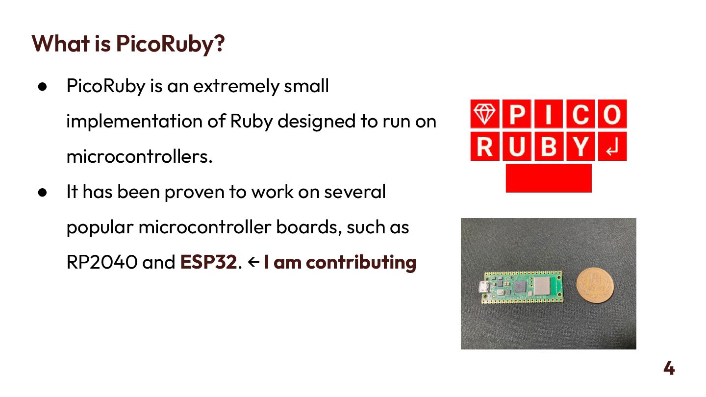 of Ruby designed to run on microcontrollers. • It has been proven to work on several popular microcontroller boards, such as RP2040 and ESP32. 3