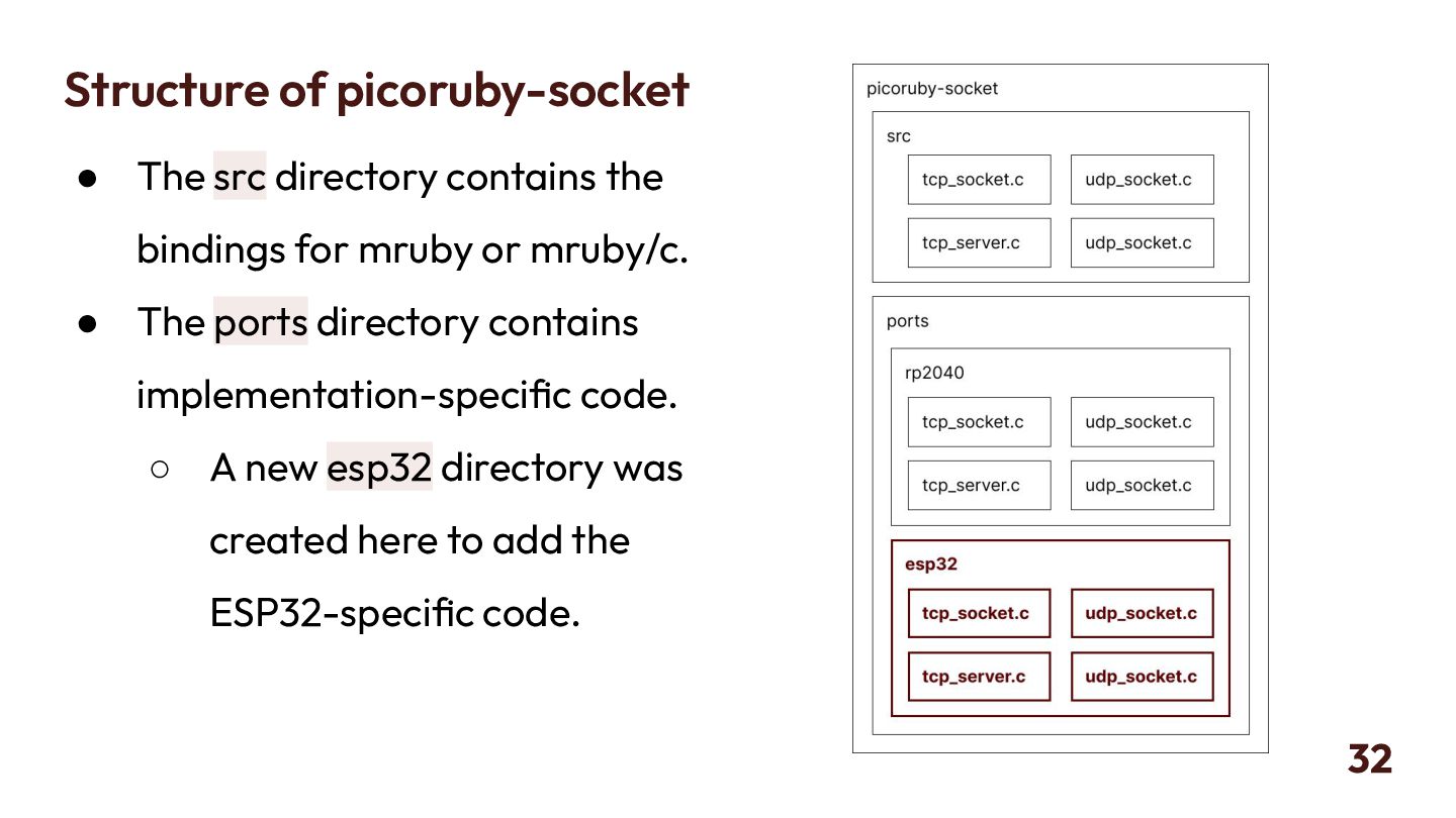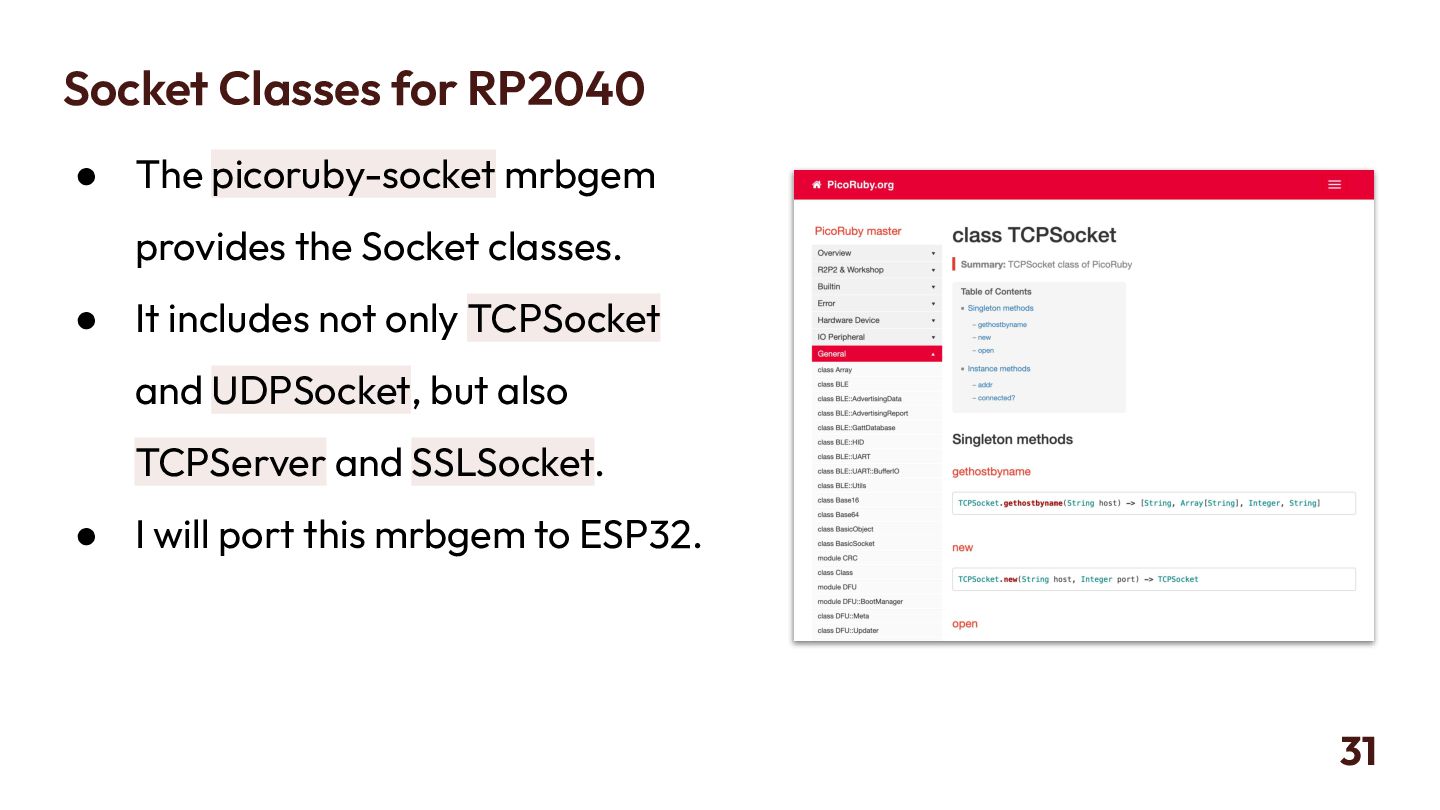 Socket classes. • It includes not only TCPSocket and UDPSocket, but also TCPServer and SSLSocket. • I will port this mrbgem to ESP32. 31