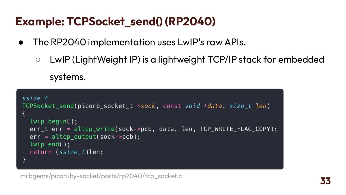 APIs. ◦ LwIP (LightWeight IP) is a lightweight TCP/IP stack for embedded systems. 33 mrbgems/picoruby-socket/ports/rp2040/tcp_socket.c