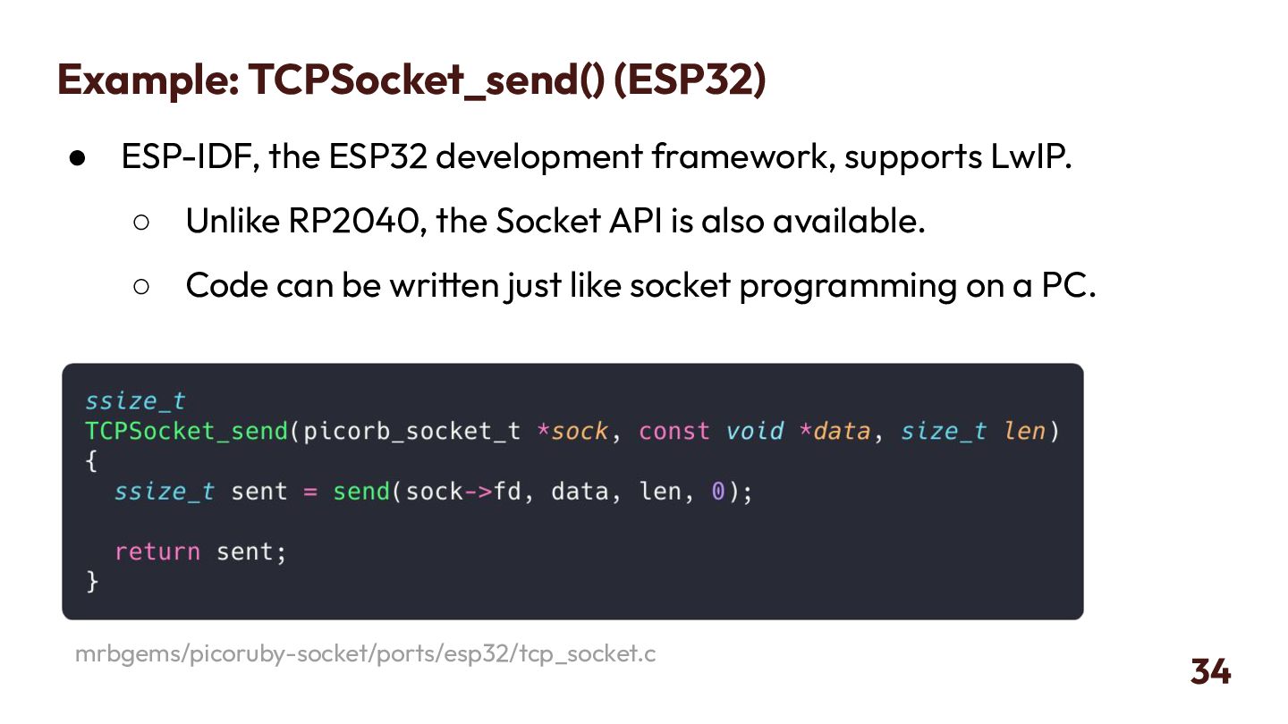 LwIP. ◦ Unlike RP2040, the Socket API is also available. ◦ Code can be written just like socket programming on a PC. 34 mrbgems/picoruby-socket/ports/esp32/tcp_socket.c