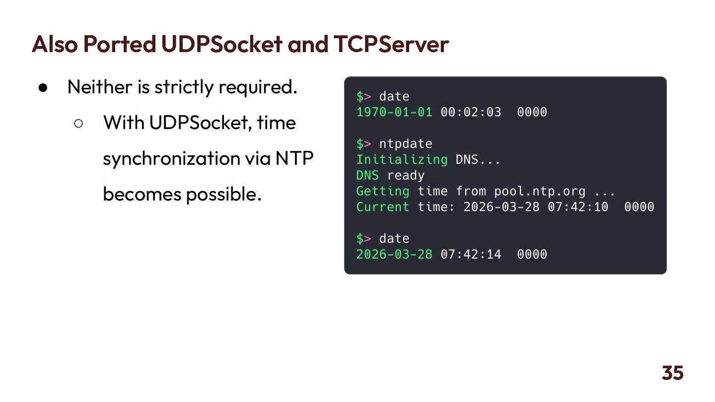 ◦ With UDPSocket, time synchronization via NTP becomes possible. 35
