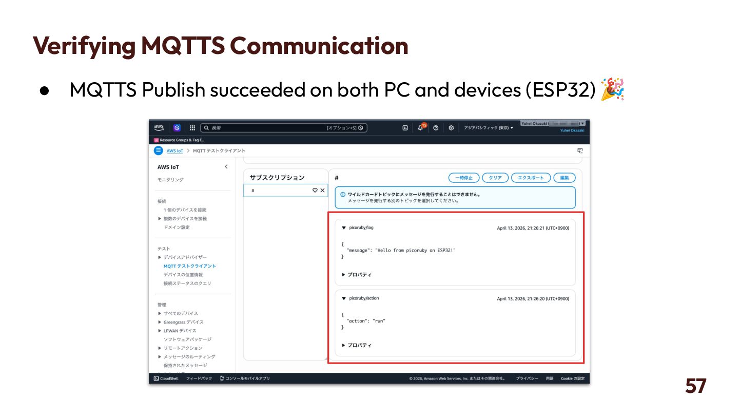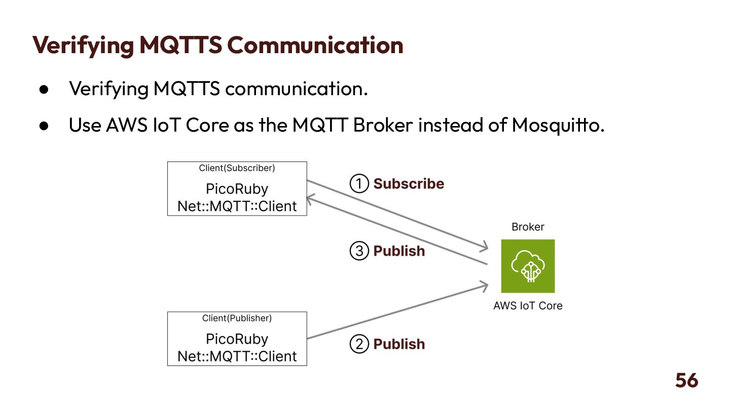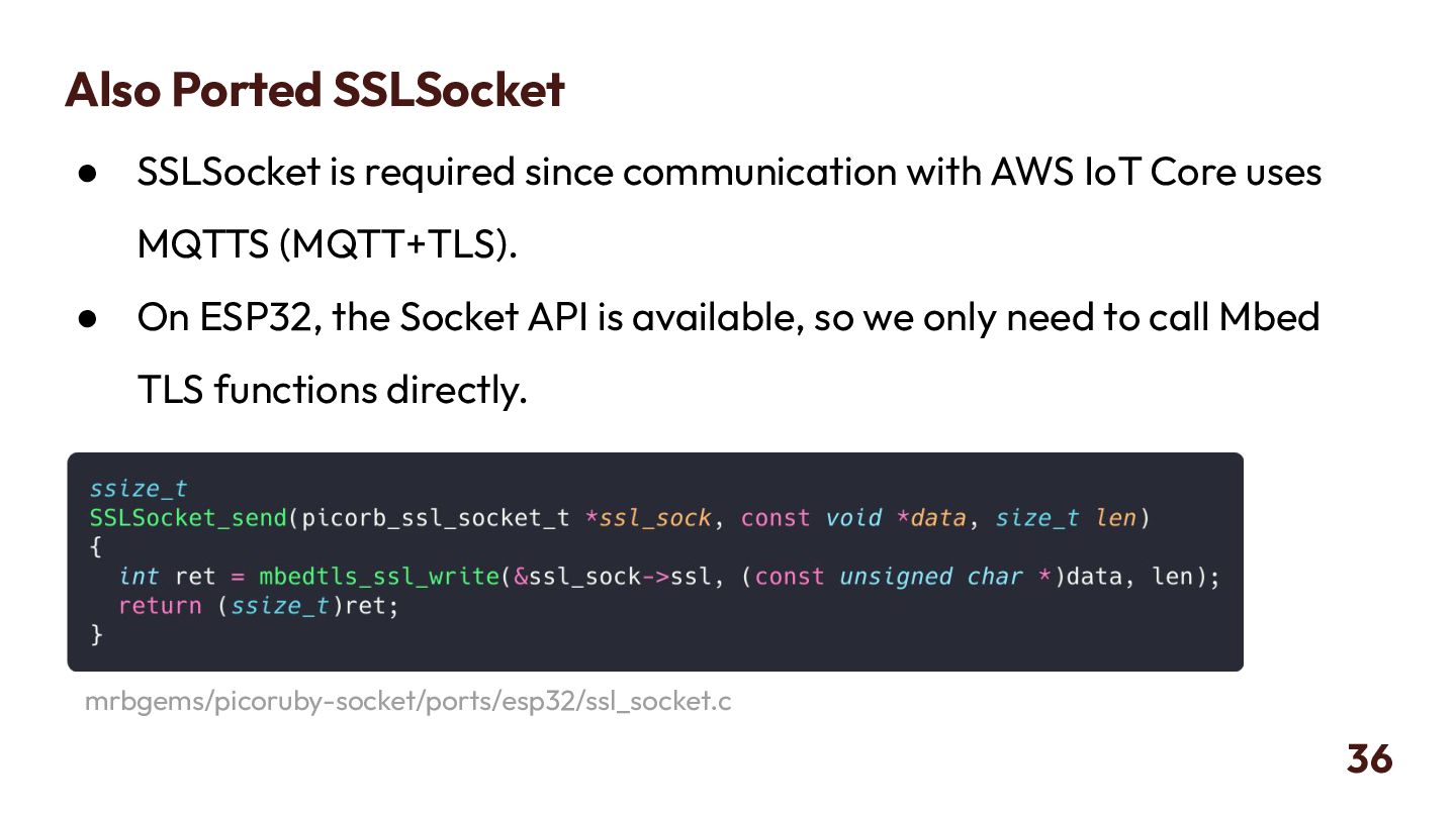 AWS IoT Core uses MQTTS (MQTT+TLS). • On ESP32, the Socket API is available, so we only need to call Mbed TLS functions directly. 36 mrbgems/picoruby-socket/ports/esp32/ssl_socket.c