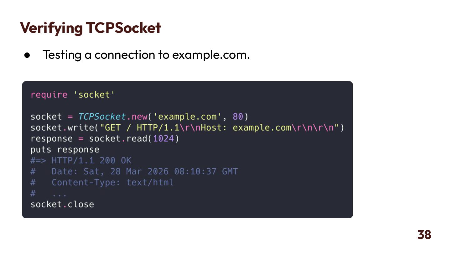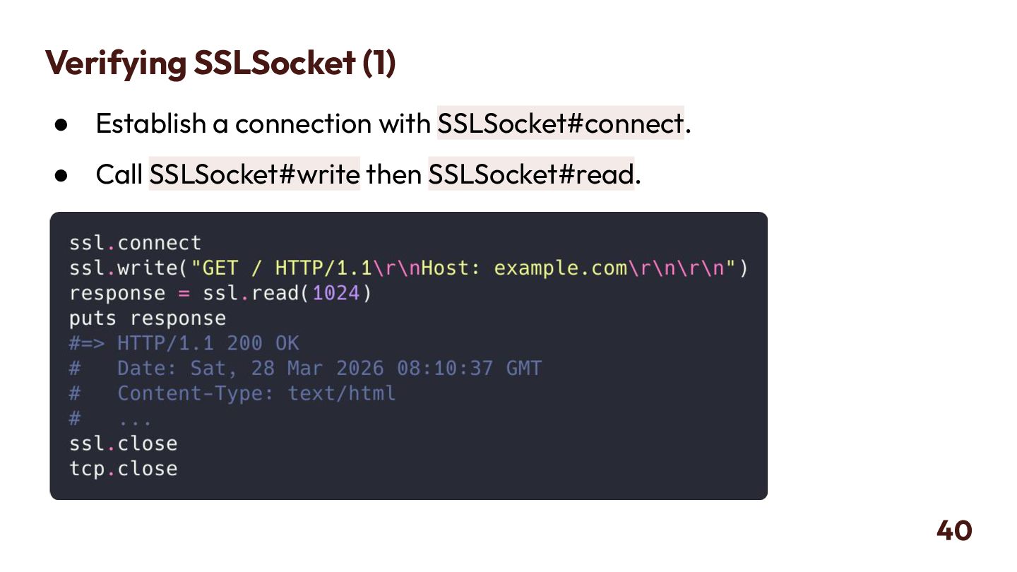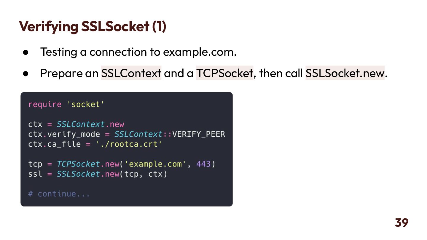 Prepare an SSLContext and a TCPSocket, then call SSLSocket.new. 39