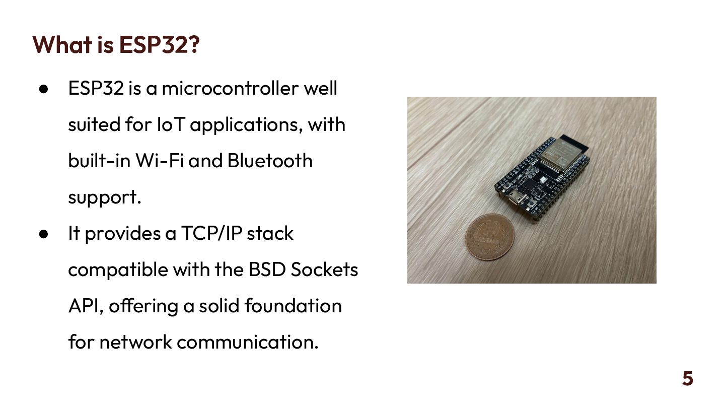 for IoT applications, with built-in Wi-Fi and Bluetooth support. • It provides a TCP/IP stack compatible with the BSD Sockets API, offering a solid foundation for network communication. 5