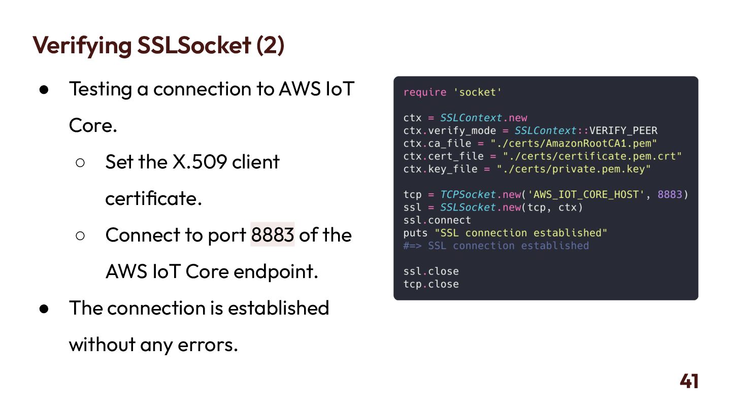 Core. ◦ Set the X.509 client certificate. ◦ Connect to port 8883 of the AWS IoT Core endpoint. • The connection is established without any errors. 41