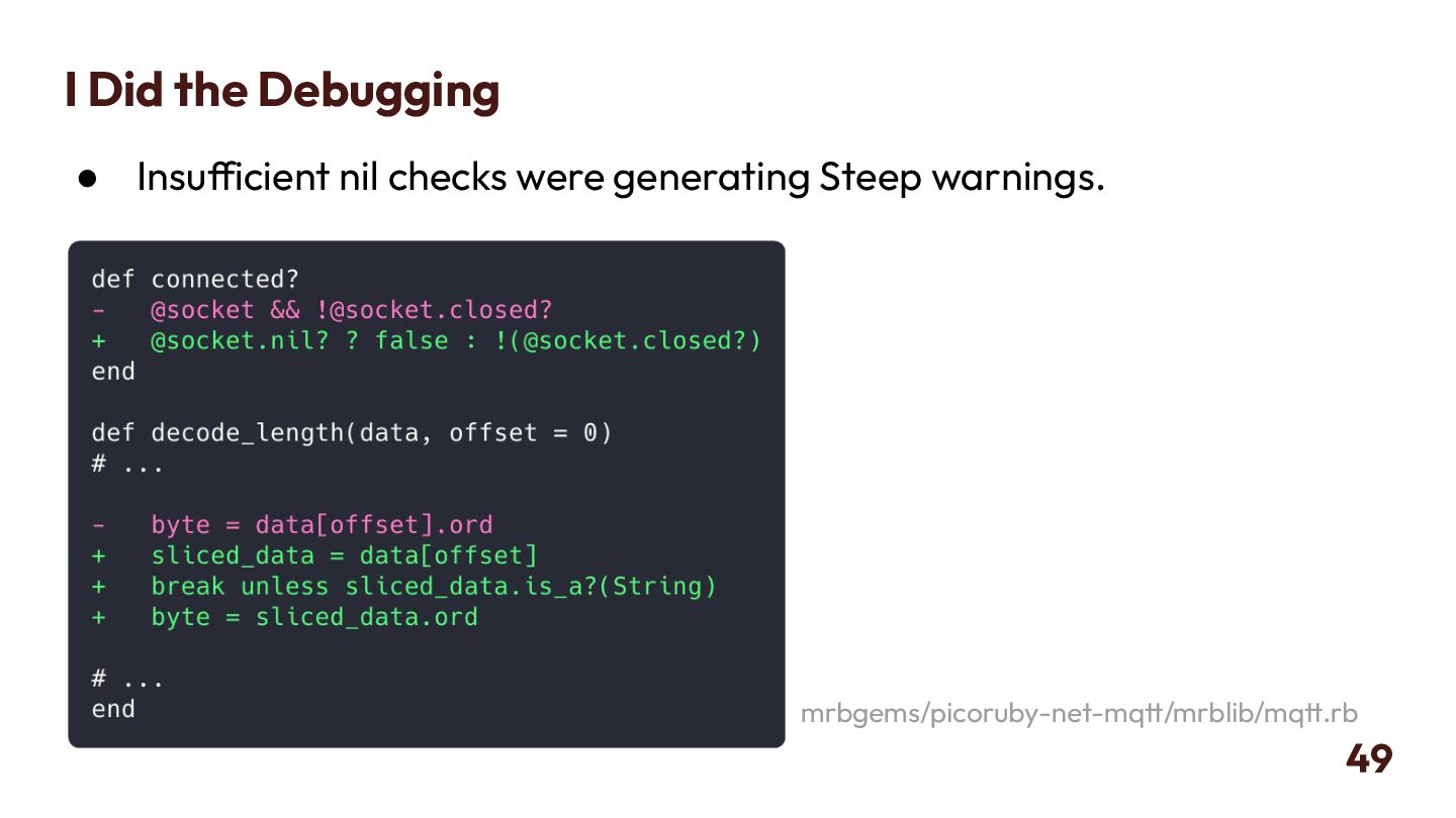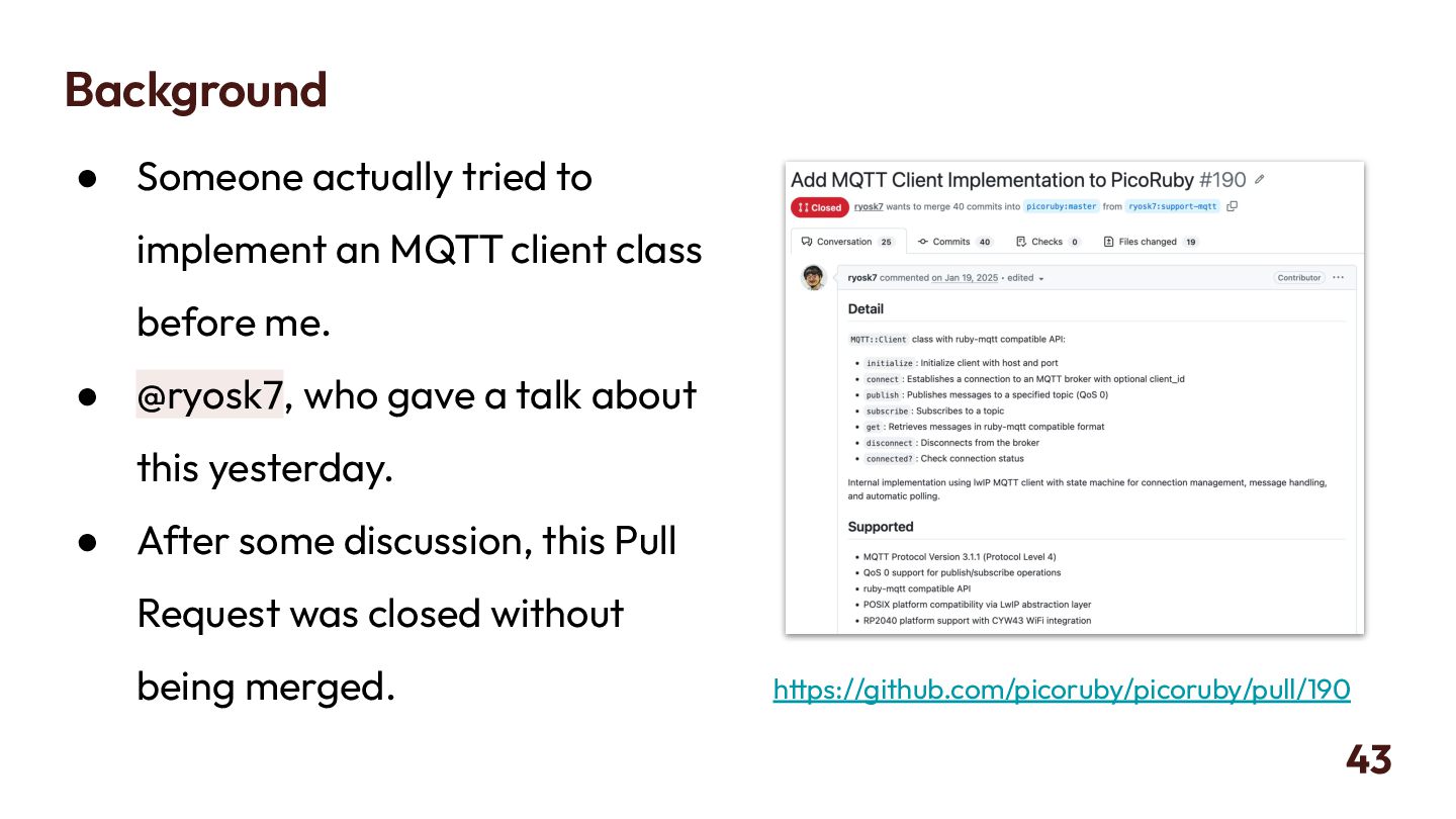 class before me. • @ryosk7, who gave a talk about this yesterday. • After some discussion, this Pull Request was closed without being merged. 43 https://github.com/picoruby/picoruby/pull/190