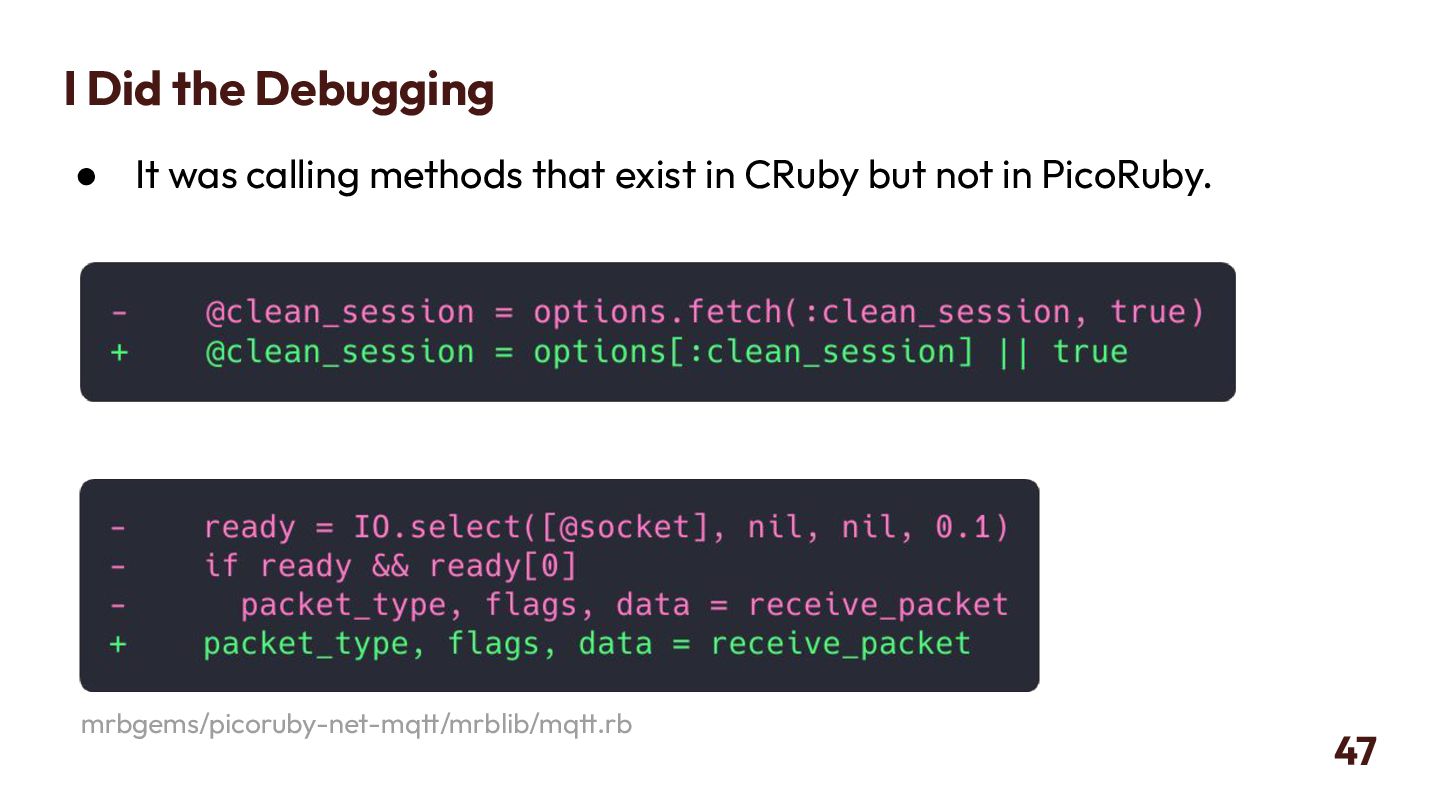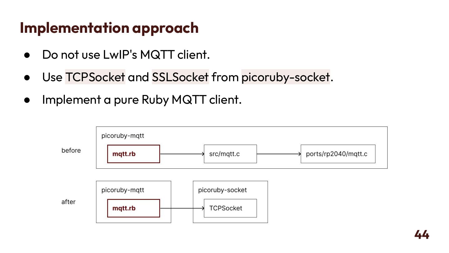 Use TCPSocket and SSLSocket from picoruby-socket. • Implement a pure Ruby MQTT client. 44
