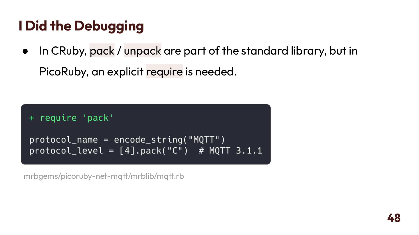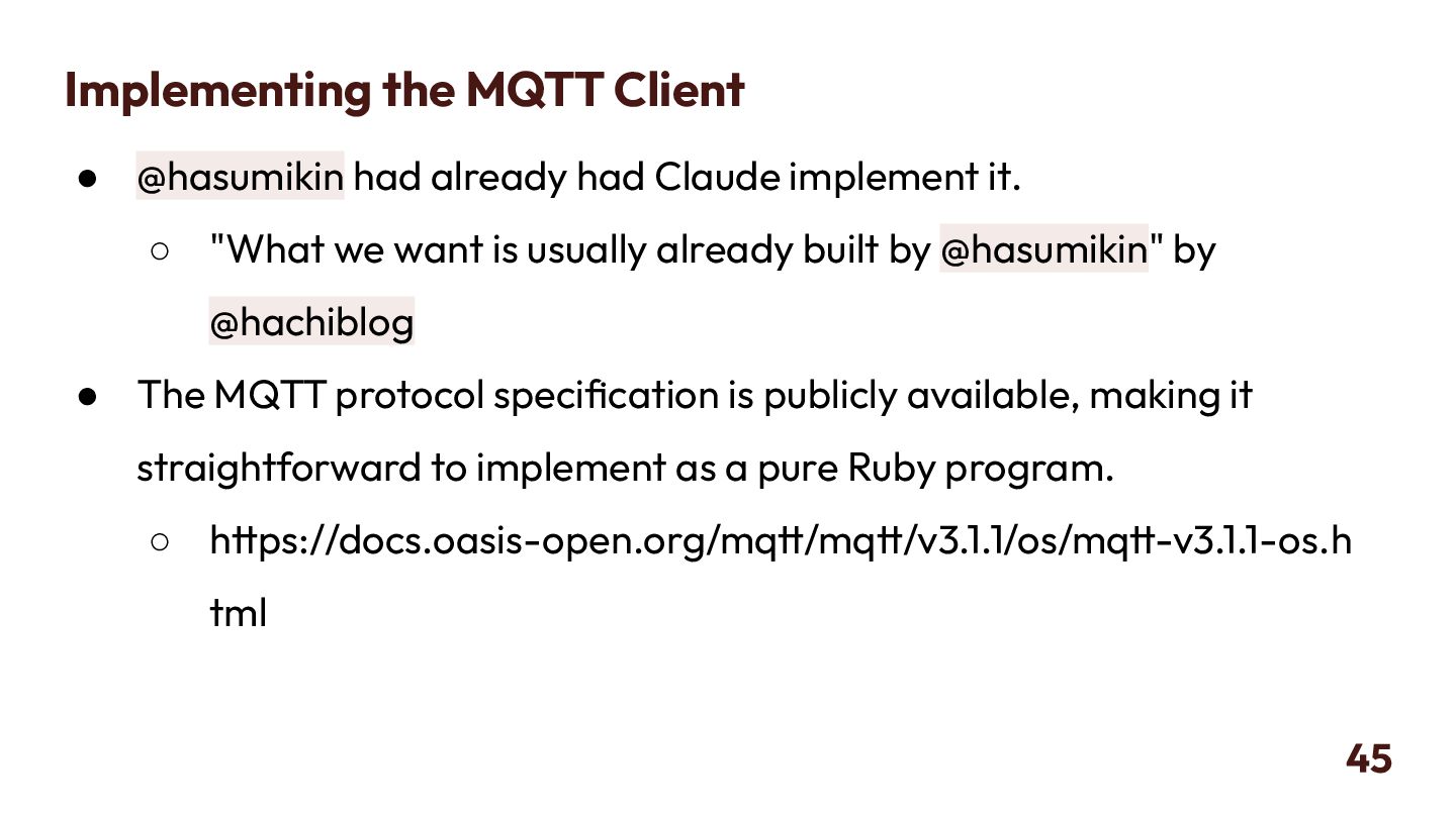 implement it. ◦ "What we want is usually already built by @hasumikin" by @hachiblog • The MQTT protocol specification is publicly available, making it straightforward to implement as a pure Ruby program. ◦ https://docs.oasis-open.org/mqtt/mqtt/v3.1.1/os/mqtt-v3.1.1-os.h tml 45