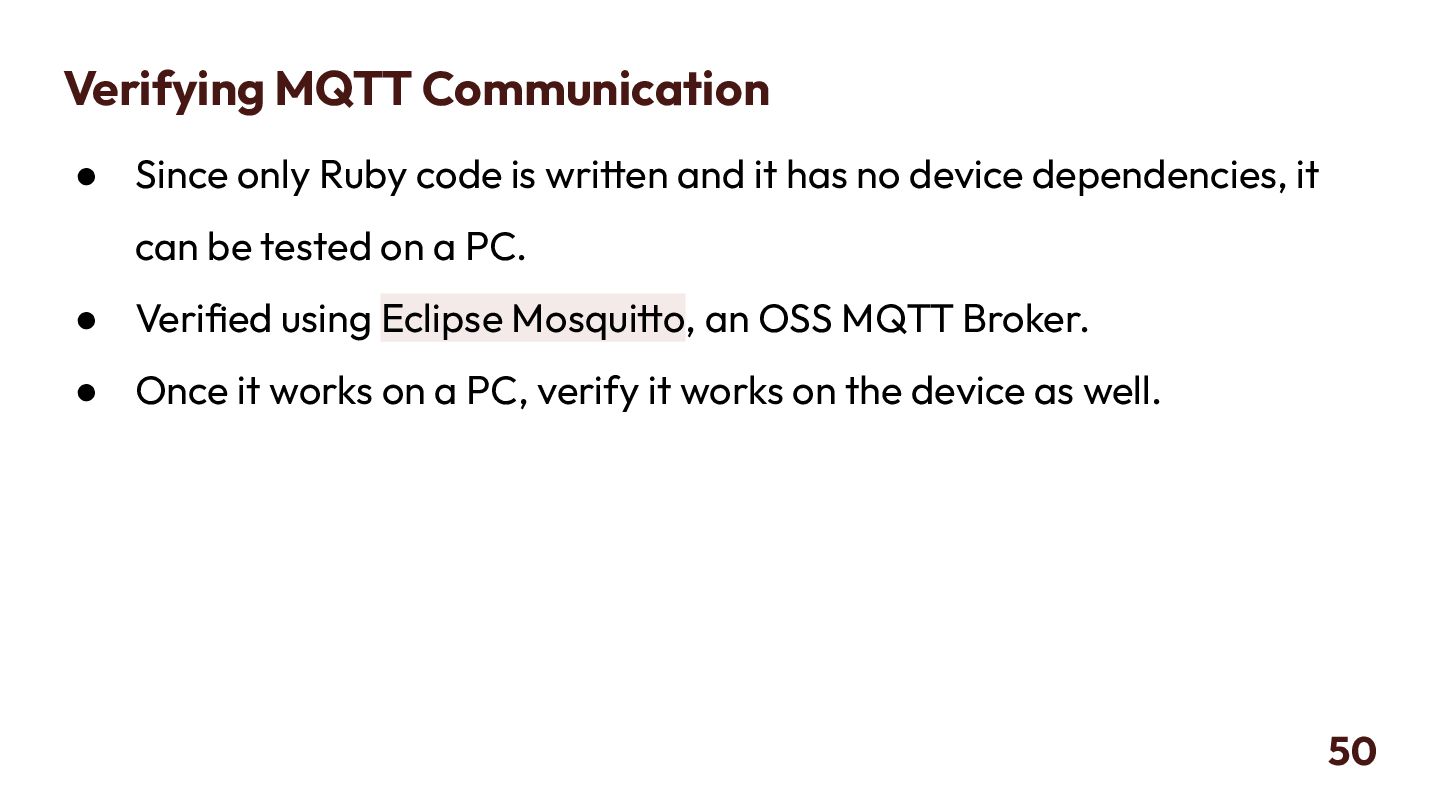 and it has no device dependencies, it can be tested on a PC. • Verified using Eclipse Mosquitto, an OSS MQTT Broker. • Once it works on a PC, verify it works on the device as well. 50