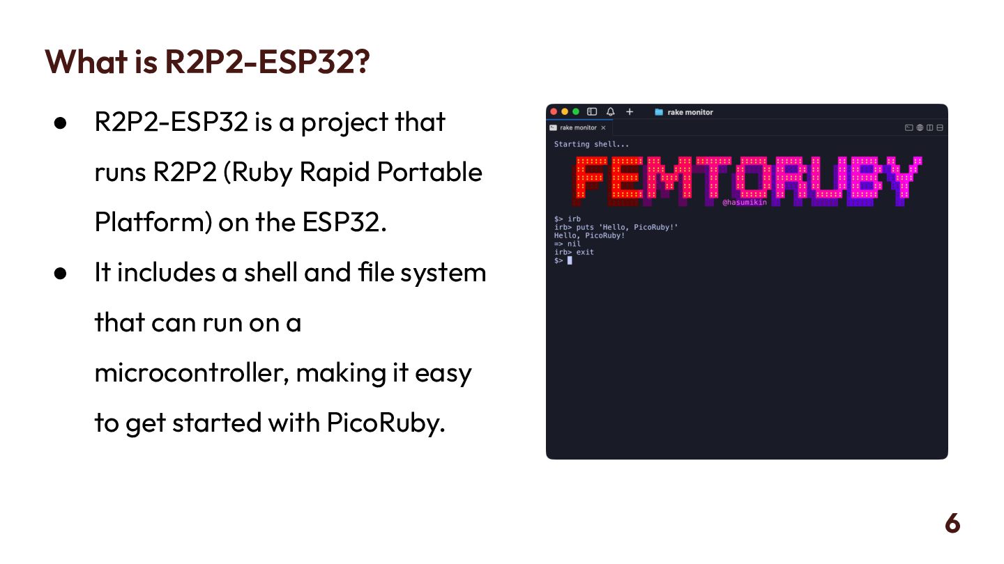 R2P2 (Ruby Rapid Portable Platform) on the ESP32. • It includes a shell and file system that can run on a microcontroller, making it easy to get started with PicoRuby. 6