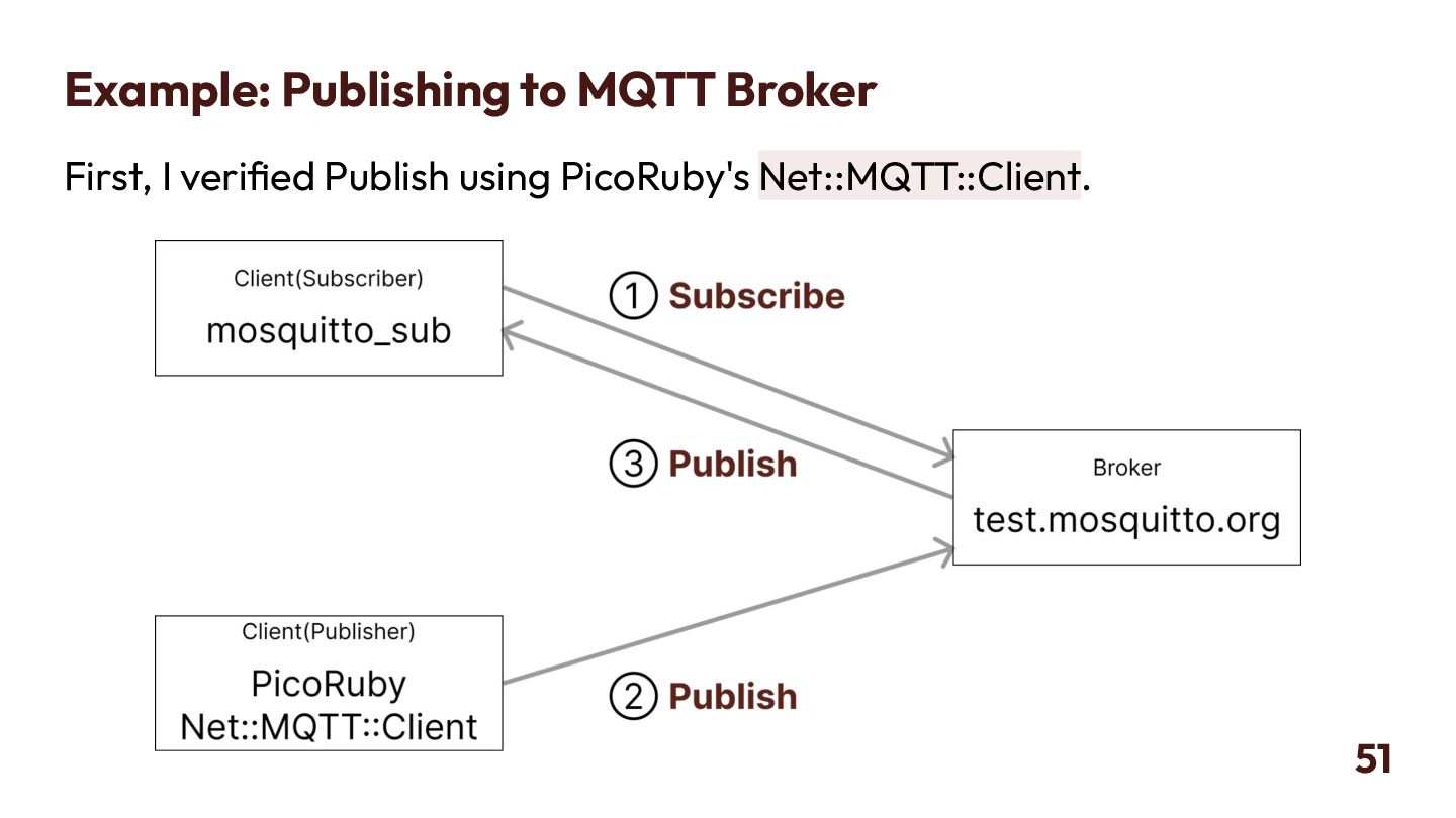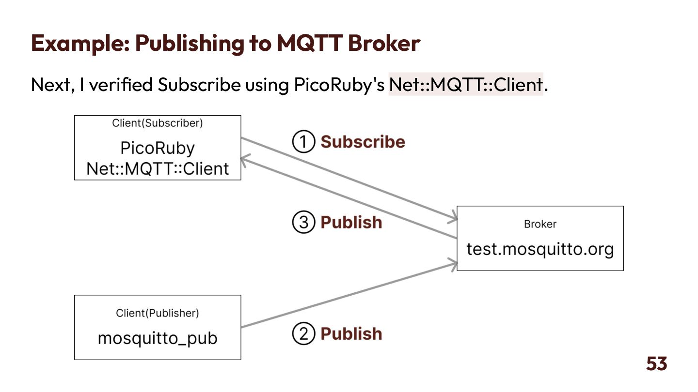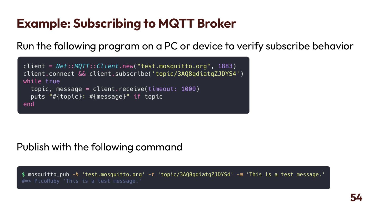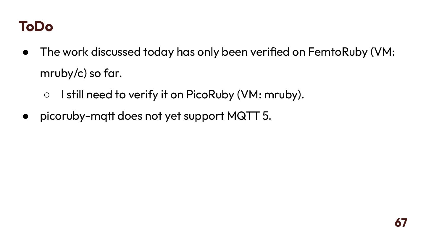 on FemtoRuby (VM: mruby/c) so far. ◦ I still need to verify it on PicoRuby (VM: mruby). • picoruby-mqtt does not yet support MQTT 5. 67