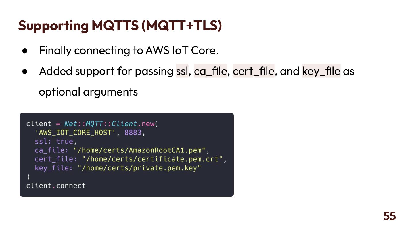44. Supporting MQTTS (MQTT+TLS) • Finally connecting to AWS IoT Core.