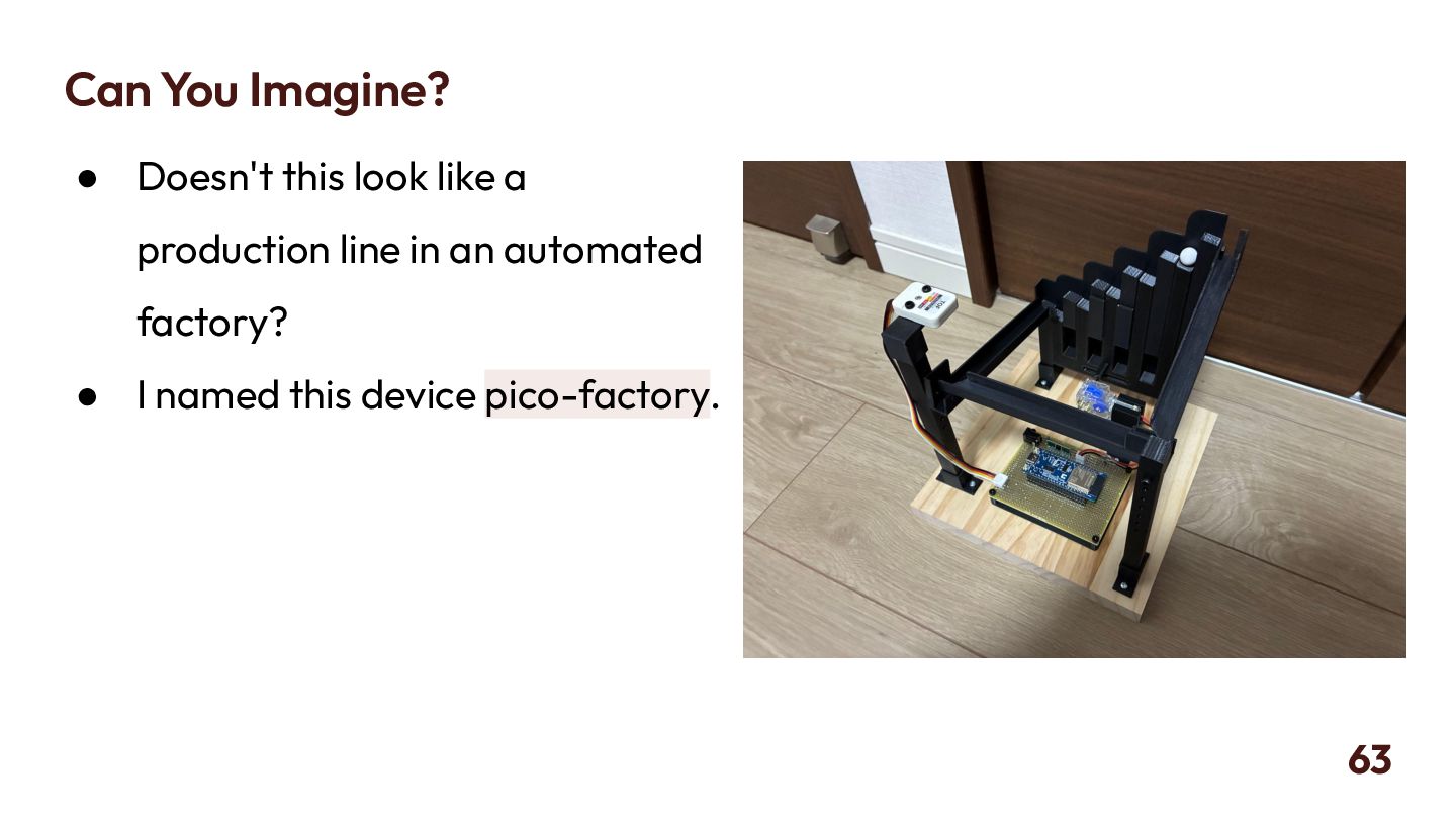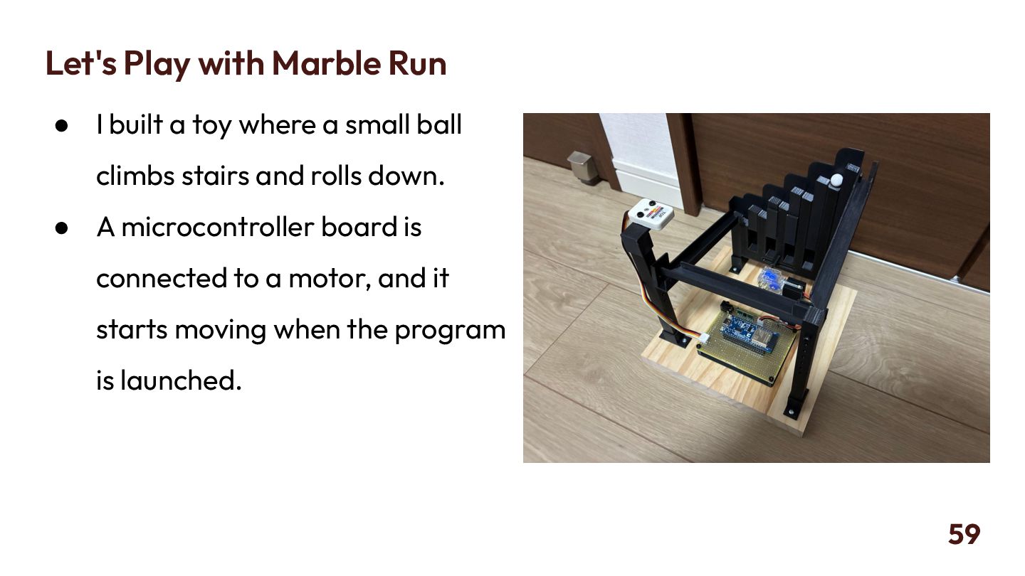where a small ball climbs stairs and rolls down. • A microcontroller board is connected to a motor, and it starts moving when the program is launched. 59
