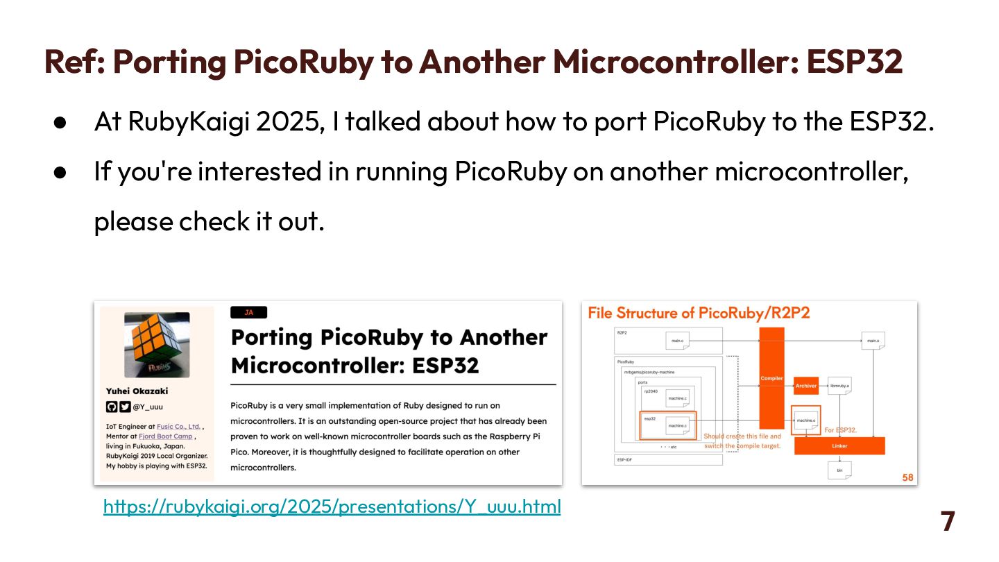 2025, I talked about how to port PicoRuby to the ESP32. • If you're interested in running PicoRuby on another microcontroller, please check it out. 7 https://rubykaigi.org/2025/presentations/Y_uuu.html