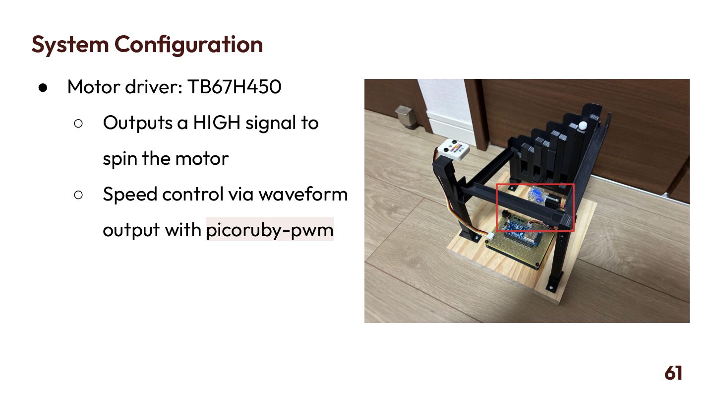 signal to spin the motor ◦ Speed control via waveform output with picoruby-pwm 61