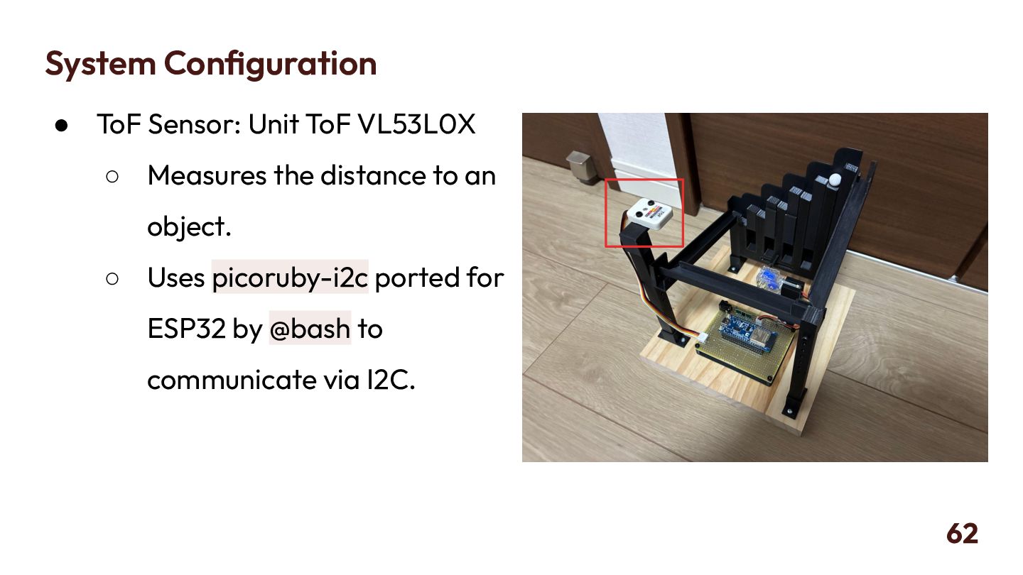 the distance to an object. ◦ Uses picoruby-i2c ported for ESP32 by @bash to communicate via I2C. 62