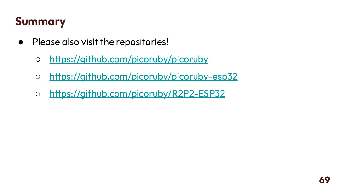 https://github.com/picoruby/picoruby-esp32 ◦ https://github.com/picoruby/R2P2-ESP32 69