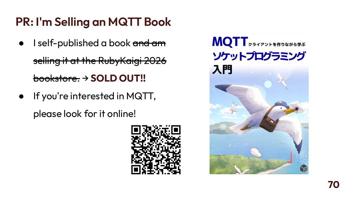 book and am selling it at the RubyKaigi 2026 bookstore. → SOLD OUT!! • If you're interested in MQTT, please look for it online! 70