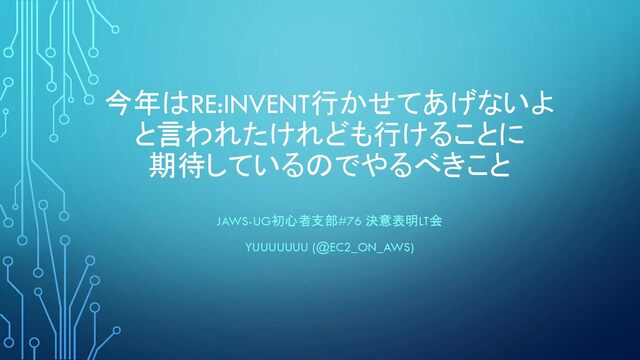 今年はRE:INVENT行かせてあげないよ と言われたけれども行けることに 期待しているのでやるべきこと JAWS-UG初心者支部#76 決意表明LT会 YUUUUUUU (@EC2_ON_AWS)