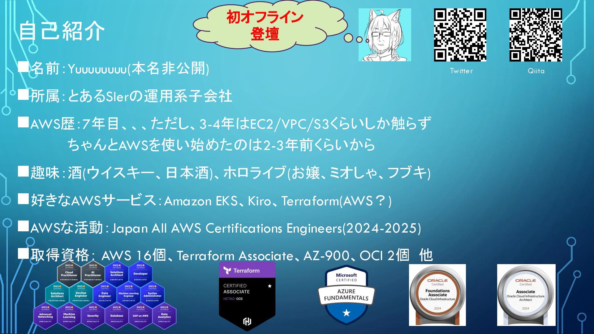 自己紹介 ◼名前:Yuuuuuuuu(本名非公開) ◼所属:とあるSIerの運用系子会社 ◼AWS歴:7年目、、、ただし、3-4年はEC2/VPC/S3くらいしか触らず ちゃんとAWSを使い始めたのは2-3年前くらいから ◼趣味:酒(ウイスキー、日本酒)、ホロライブ(お嬢、ミオしゃ、フブキ) ◼好きなAWSサービス:Amazon EKS、Kiro、Terraform(AWS?) ◼AWSな活動:Japan All