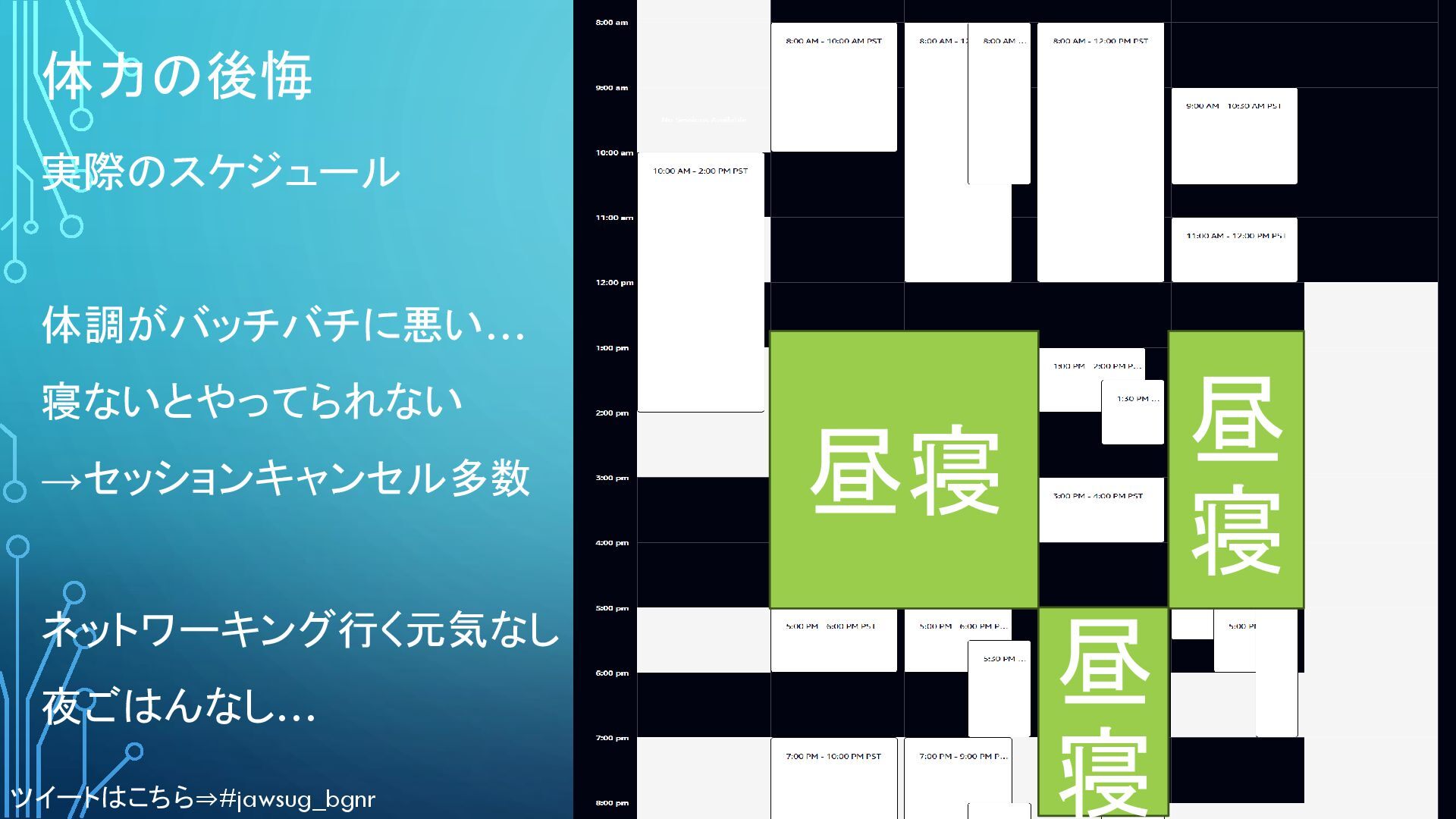 体力の後悔 実際のスケジュール 体調がバッチバチに悪い… 寝ないとやってられない →セッションキャンセル多数 ネットワーキング行く元気なし 夜ごはんなし… ツイートはこちら⇒#jawsug_bgnr 昼寝 昼