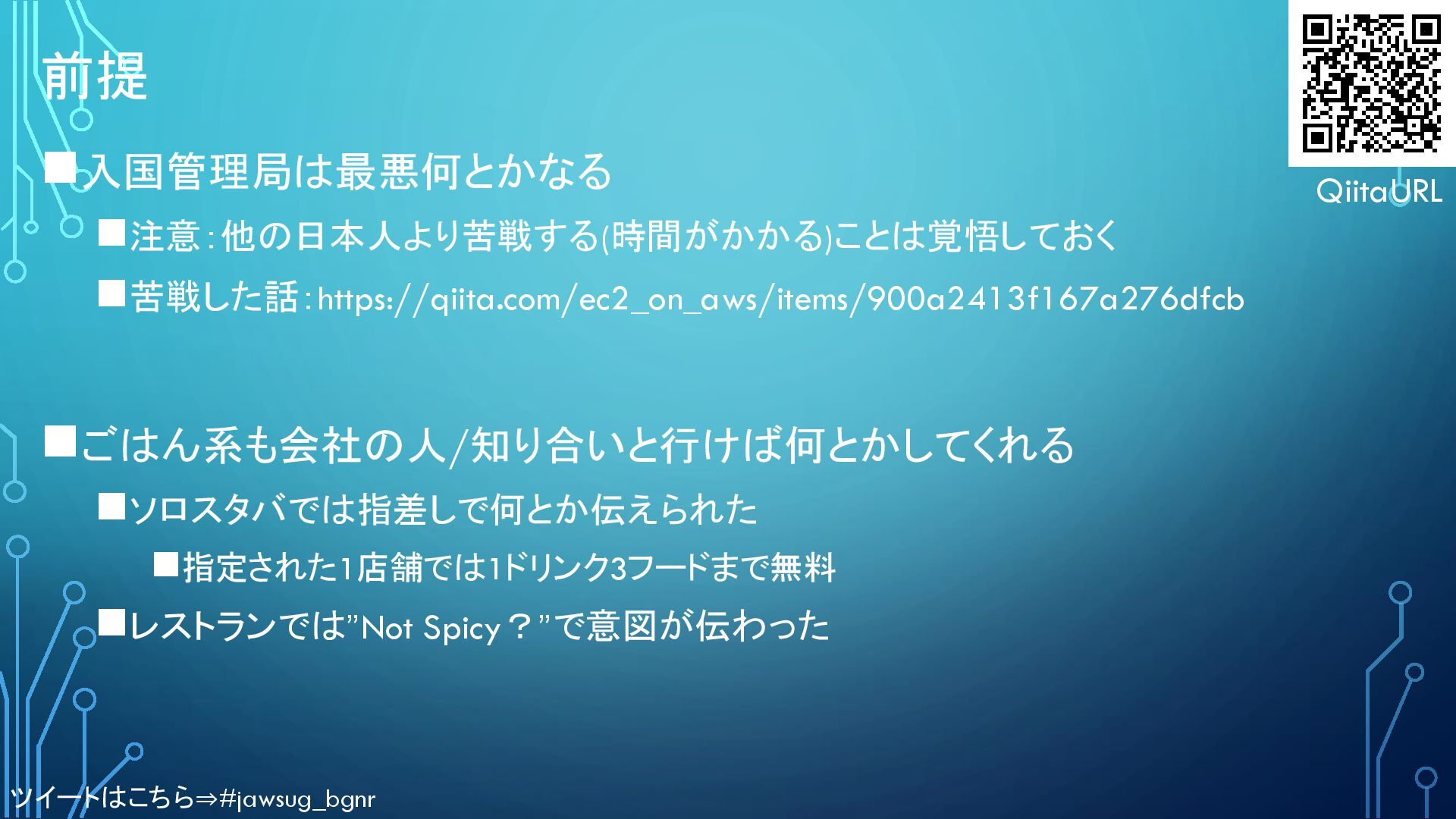前提 ◼入国管理局は最悪何とかなる ◼注意:他の日本人より苦戦する(時間がかかる)ことは覚悟しておく ◼苦戦した話:https://qiita.com/ec2_on_aws/items/900a2413f167a276dfcb ◼ごはん系も会社の人/知り合いと行けば何とかしてくれる ◼ソロスタバでは指差しで何とか伝えられた ◼指定された1店舗では1ドリンク3フードまで無料 ◼レストランでは”Not Spicy?”で意図が伝わった QiitaURL