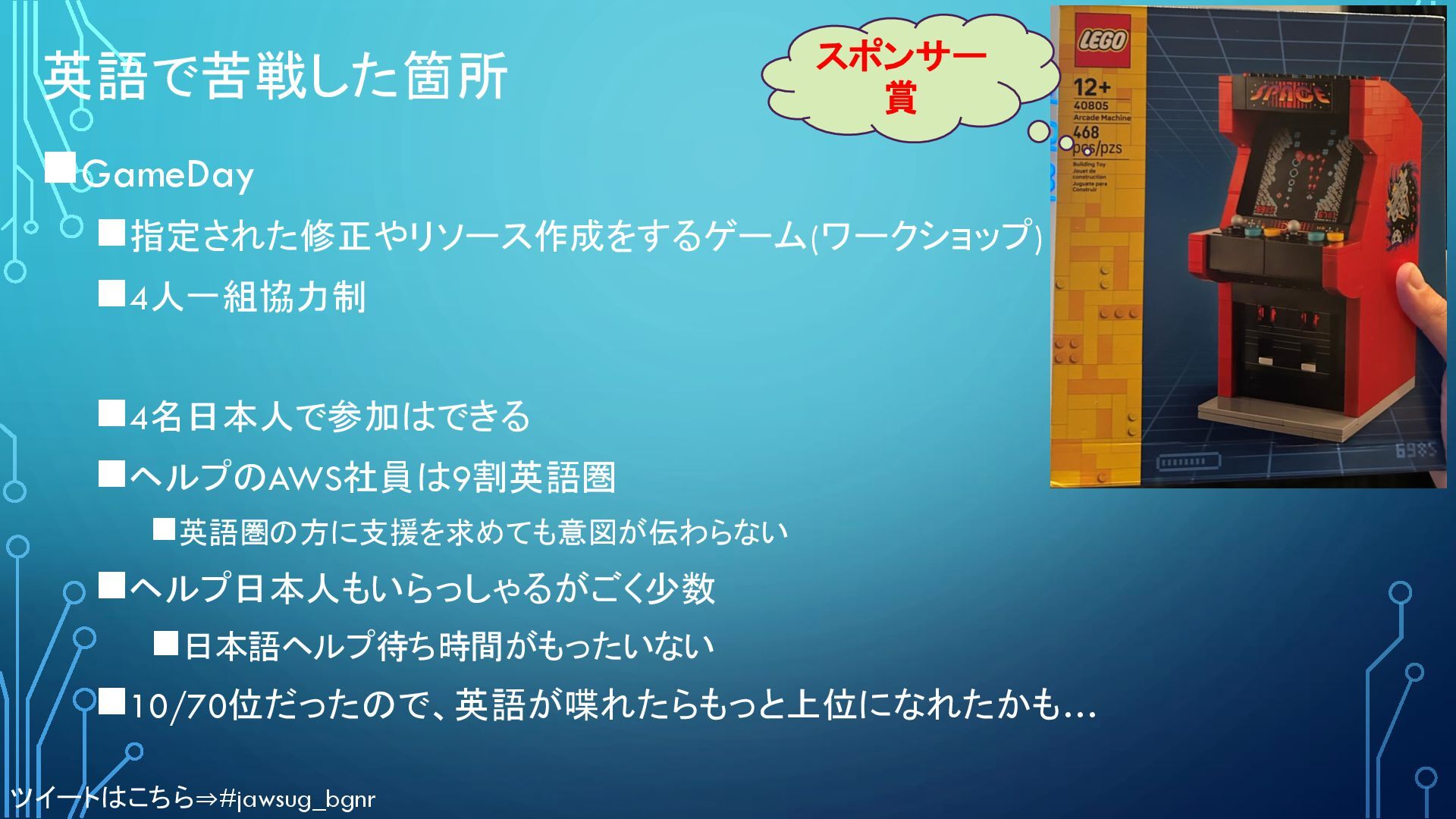 英語で苦戦した箇所 ◼GameDay ◼指定された修正やリソース作成をするゲーム(ワークショップ) ◼4人一組協力制 ◼4名日本人で参加はできる ◼ヘルプのAWS社員は9割英語圏 ◼英語圏の方に支援を求めても意図が伝わらない ◼ヘルプ日本人もいらっしゃるがごく少数 ◼日本語ヘルプ待ち時間がもったいない ◼10/70位だったので、英語が喋れたらもっと上位になれたかも…