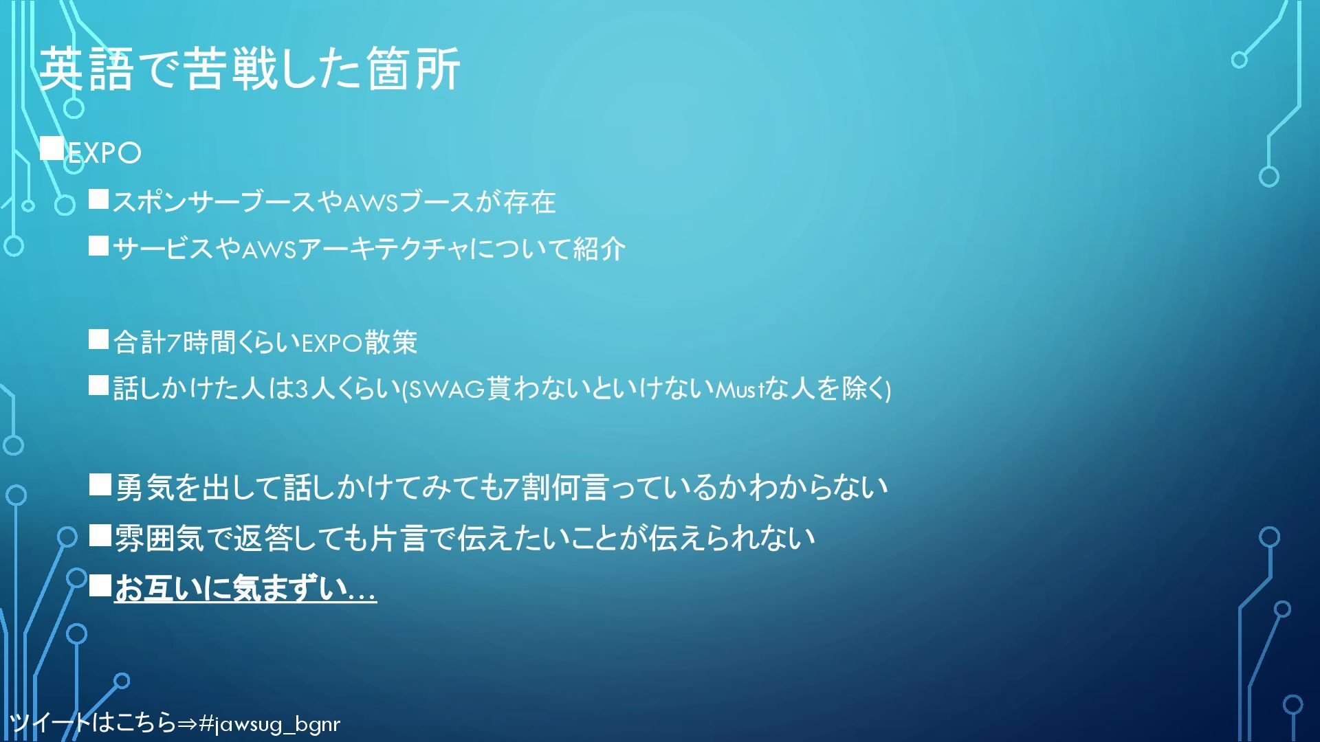 英語で苦戦した箇所 ◼EXPO ◼スポンサーブースやAWSブースが存在 ◼サービスやAWSアーキテクチャについて紹介 ◼合計7時間くらいEXPO散策 ◼話しかけた人は3人くらい(SWAG貰わないといけないMustな人を除く) ◼勇気を出して話しかけてみても7割何言っているかわからない ◼雰囲気で返答しても片言で伝えたいことが伝えられない ◼お互いに気まずい… ツイートはこちら⇒#jawsug_bgnr
