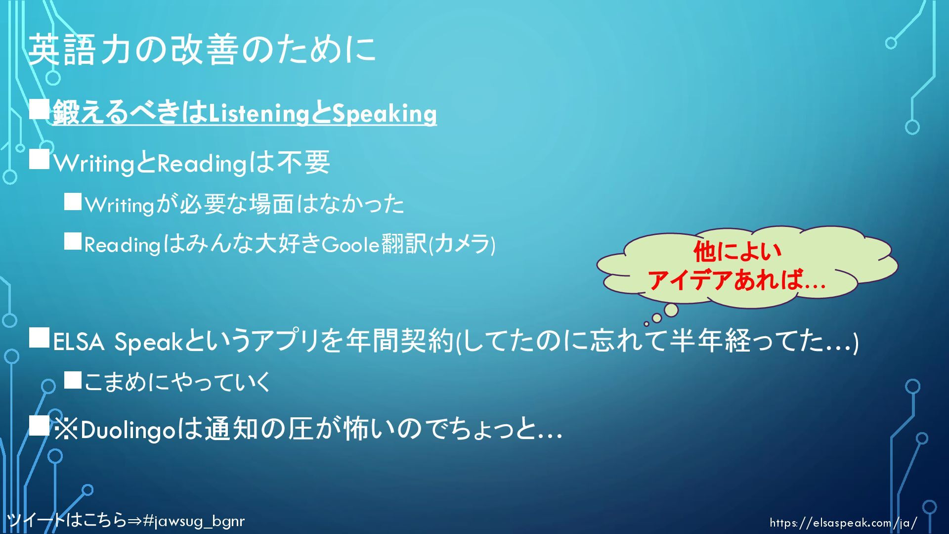 英語力の改善のために ◼鍛えるべきはListeningとSpeaking ◼WritingとReadingは不要 ◼Writingが必要な場面はなかった ◼Readingはみんな大好きGoole翻訳(カメラ) ◼ELSA Speakというアプリを年間契約(してたのに忘れて半年経ってた…) ◼こまめにやっていく ◼※Duolingoは通知の圧が怖いのでちょっと… ツイートはこちら⇒#jawsug_bgnr