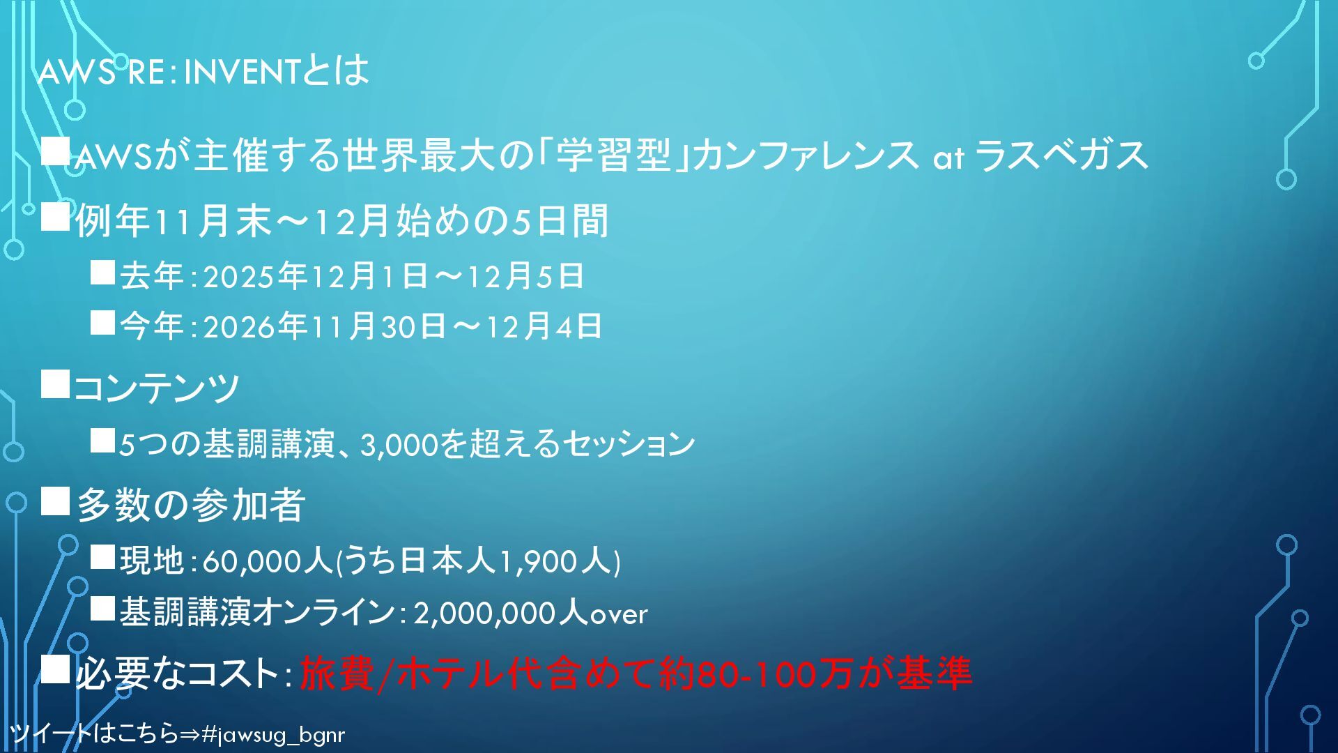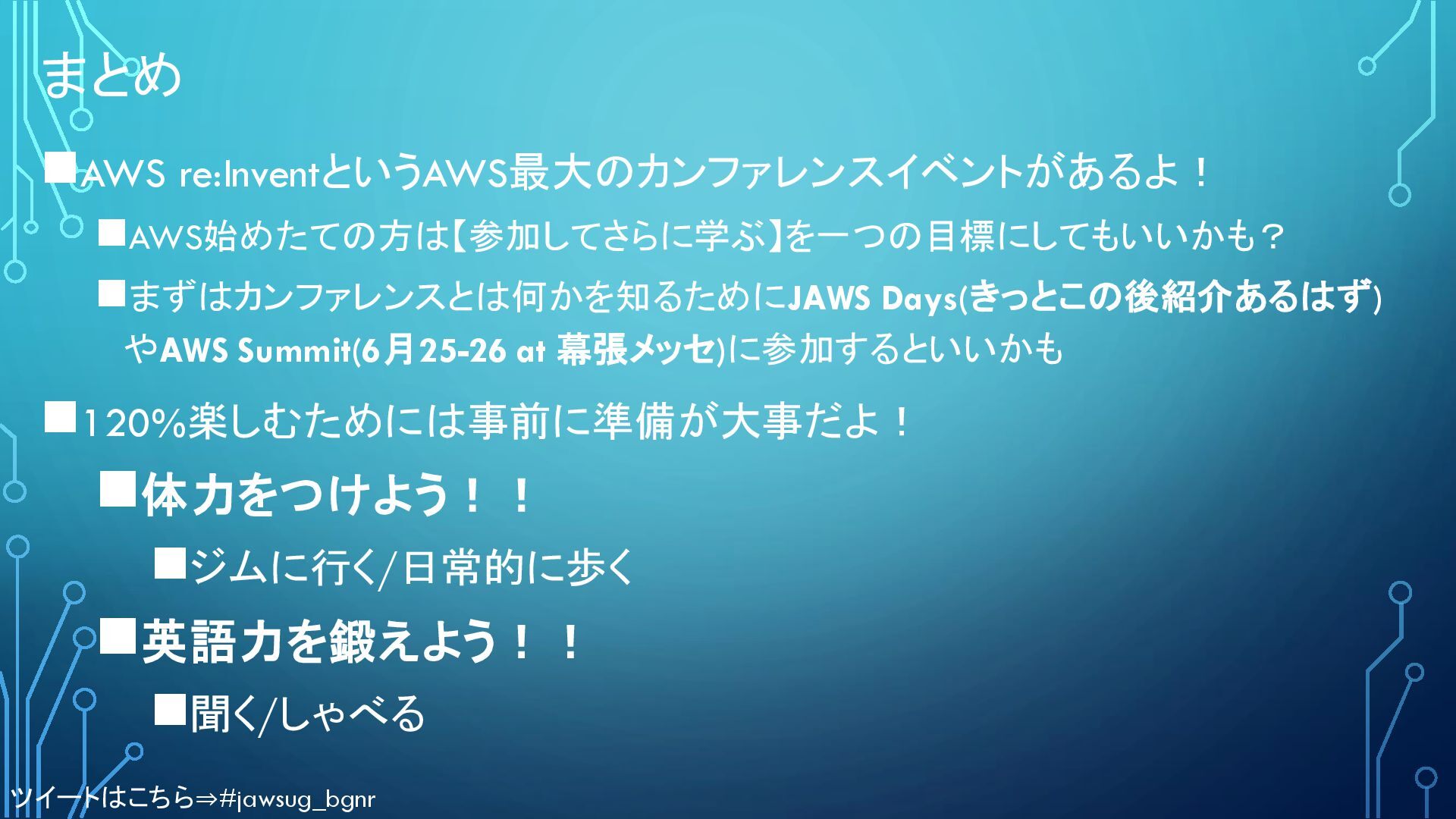 ツイートはこちら⇒#jawsug_bgnr 今年はre:Invent行かせてあげないよと言われたけれども 行けること期待しているのでやるべきこと
