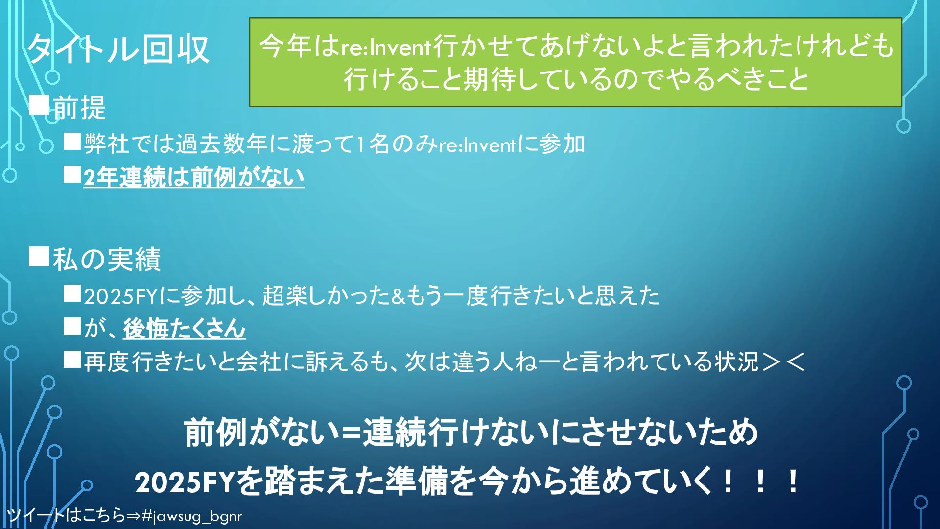 タイトル回収 ◼前提 ◼弊社では過去数年に渡って1名のみre:Inventに参加 ◼2年連続は前例がない ◼私の実績 ◼2025FYに参加し、超楽しかった&もう一度行きたいと思えた ◼が、後悔たくさん ◼再度行きたいと会社に訴えるも、次は違う人ねーと言われている状況>< 前例がない=連続行けないにさせないため 2025FYを踏まえた準備を今から進めていく!!!