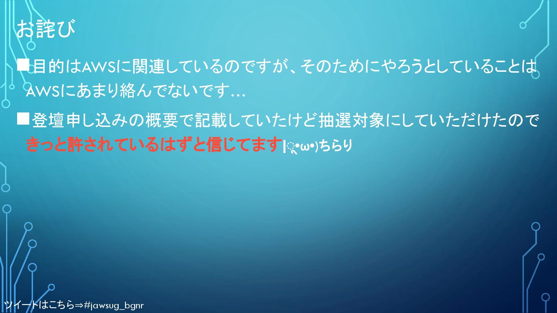 お詫び ◼目的はAWSに関連しているのですが、そのためにやろうとしていることは AWSにあまり絡んでないです… ◼登壇申し込みの概要で記載していたけど抽選対象にしていただけたので きっと許されているはずと信じてます|ू •ω•)ちらり ツイートはこちら⇒#jawsug_bgnr