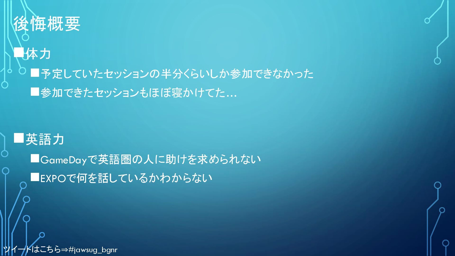 後悔概要 ◼体力 ◼予定していたセッションの半分くらいしか参加できなかった ◼参加できたセッションもほぼ寝かけてた… ◼英語力 ◼GameDayで英語圏の人に助けを求められない ◼EXPOで何を話しているかわからない ツイートはこちら⇒#jawsug_bgnr