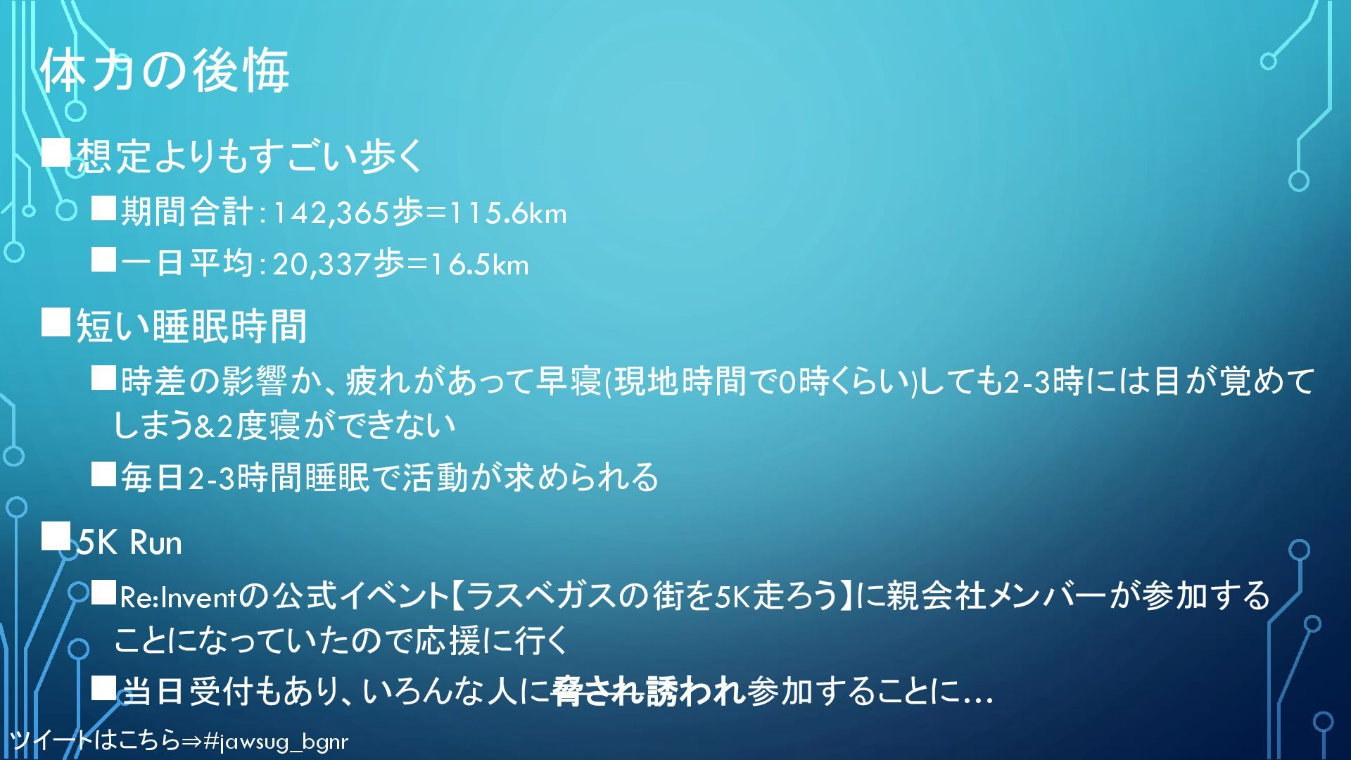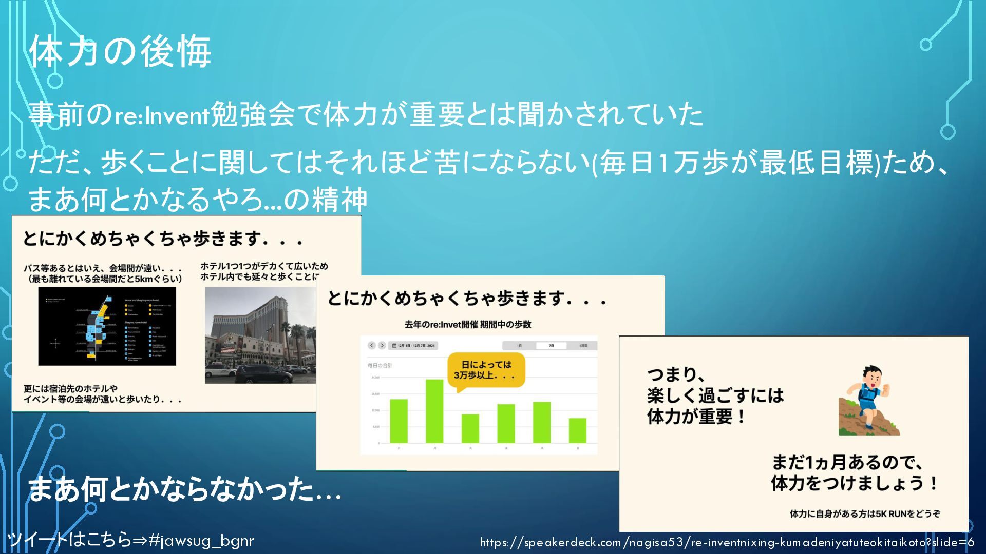 体力の後悔 事前のre:Invent勉強会で体力が重要とは聞かされていた ただ、歩くことに関してはそれほど苦にならない(毎日1万歩が最低目標)ため、 まあ何とかなるやろ...の精神 まあ何とかならなかった… ツイートはこちら⇒#jawsug_bgnr https://speakerdeck.com/nagisa53/re-inventnixing-kumadeniyatuteokitaikoto?slide=6