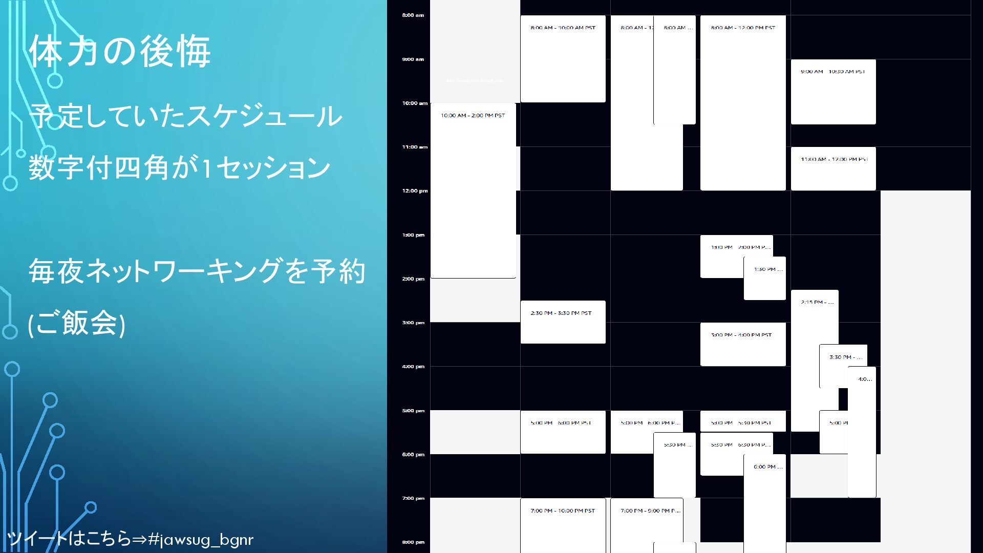 体力の後悔 予定していたスケジュール 数字付四角が1セッション 毎夜ネットワーキングを予約 (ご飯会) ツイートはこちら⇒#jawsug_bgnr