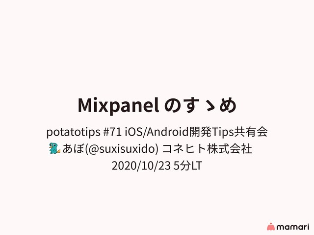 Mixpanel のすゝめ potatotips #71 iOS/Android開発Tips共有会 あぼ(@suxisuxido) コネヒト株式会社 2020/10/23 5分LT