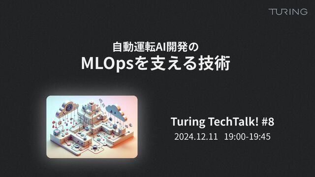 1. Turing TechTalk! #8 19:00 オープニング‧会社紹介 19:05 ⾃動運転開発のMLOpsを⽀える技術 19:15 ディスカッション&質疑応答 19:45