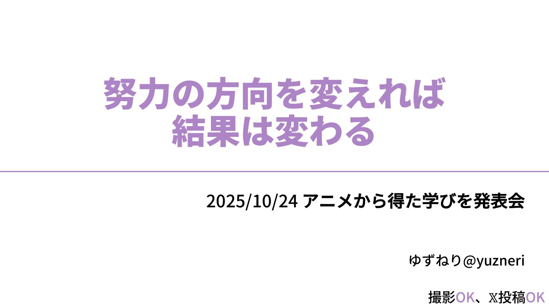 撮影OK、𝕏投稿OK ゆずねり@yuzneri 努⼒の⽅向を変えれば 結果は変わる 2025/10/24 アニメから得た学びを発表会