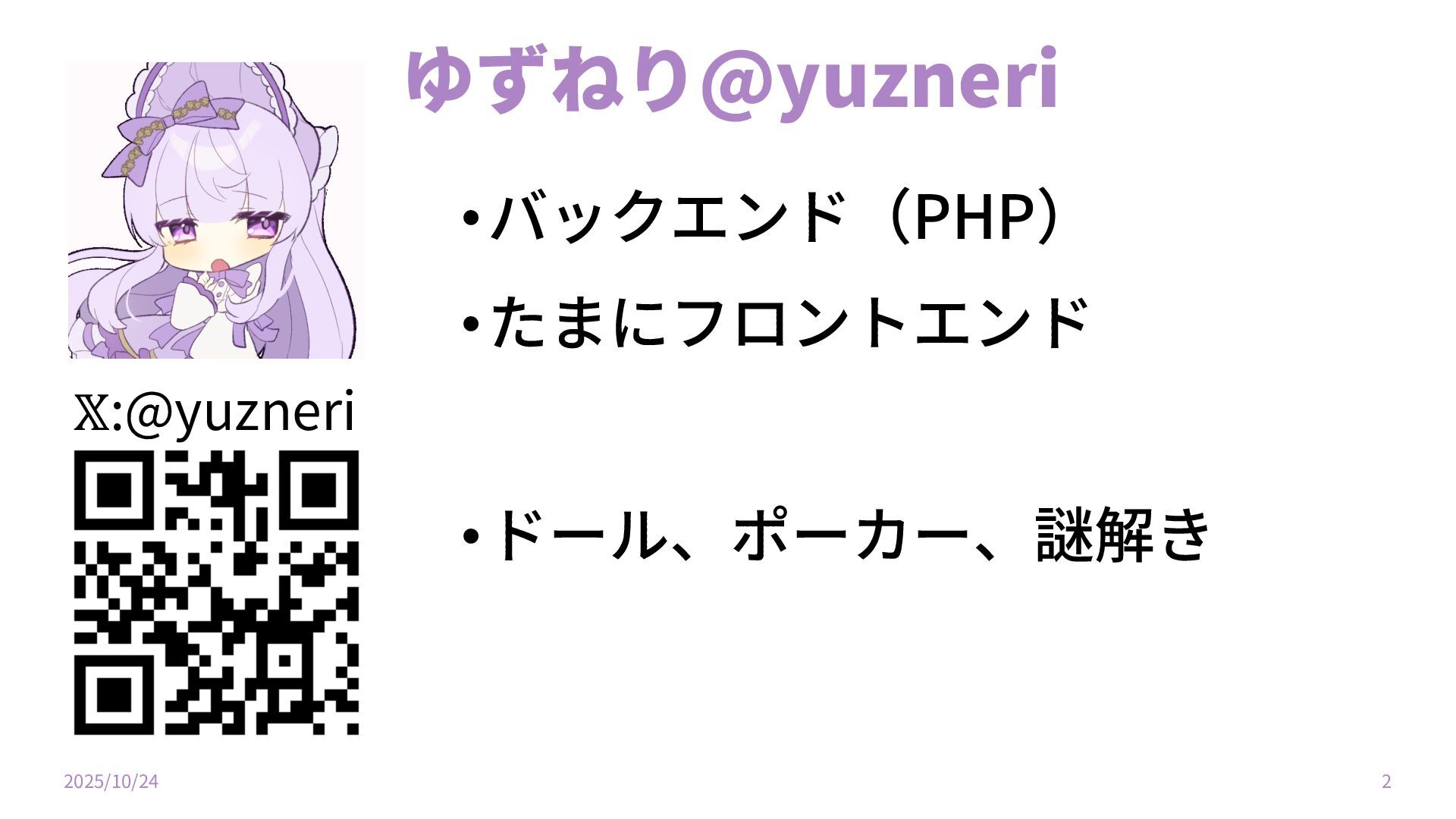 ゆずねり@yuzneri •バックエンド(PHP) •たまにフロントエンド •ドール、ポーカー、謎解き 𝕏:@yuzneri 2025/10/24 2
