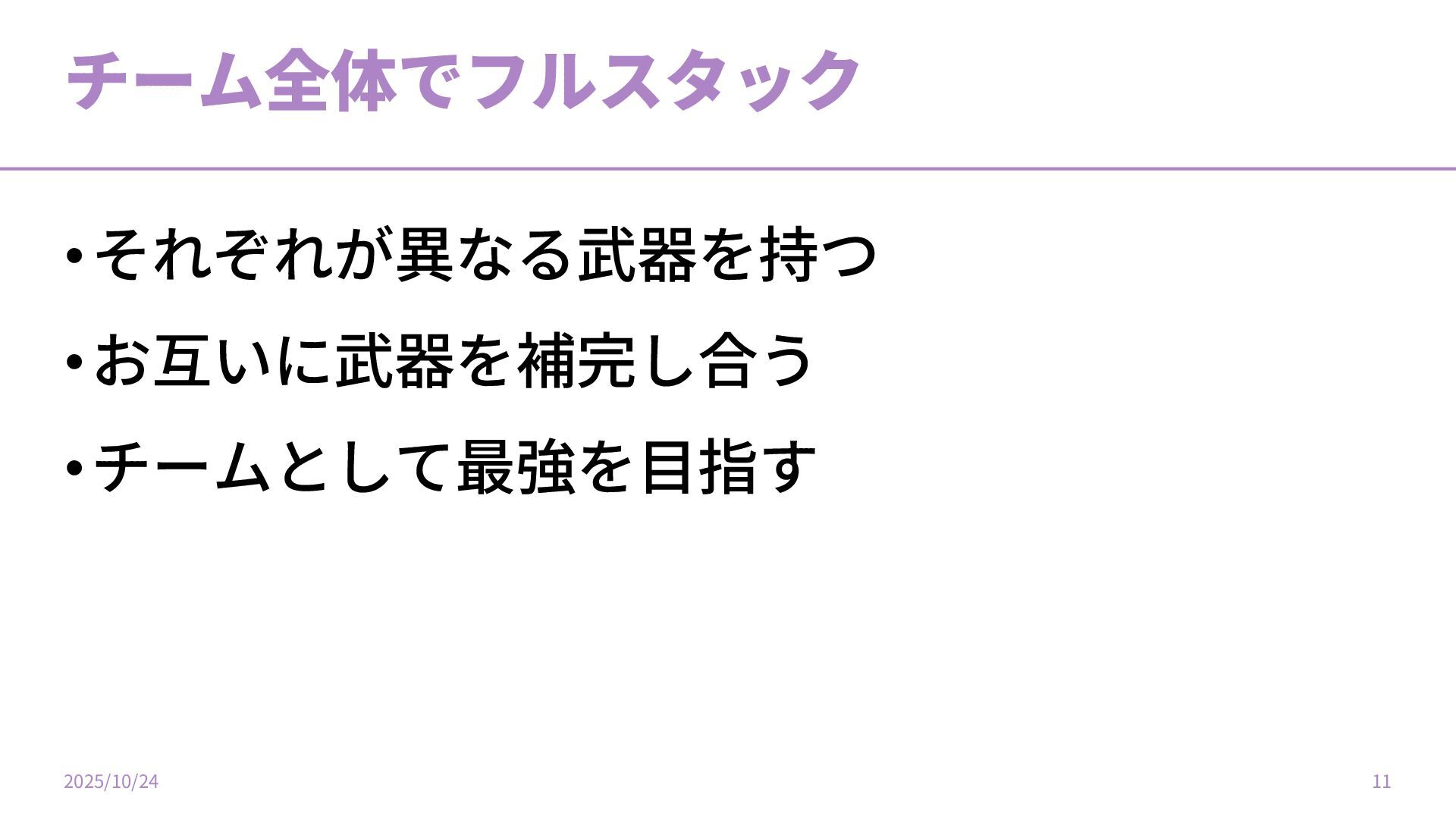 チーム全体でフルスタック •それぞれが異なる武器を持つ •お互いに武器を補完し合う •チームとして最強を⽬指す 2025/10/24 11
