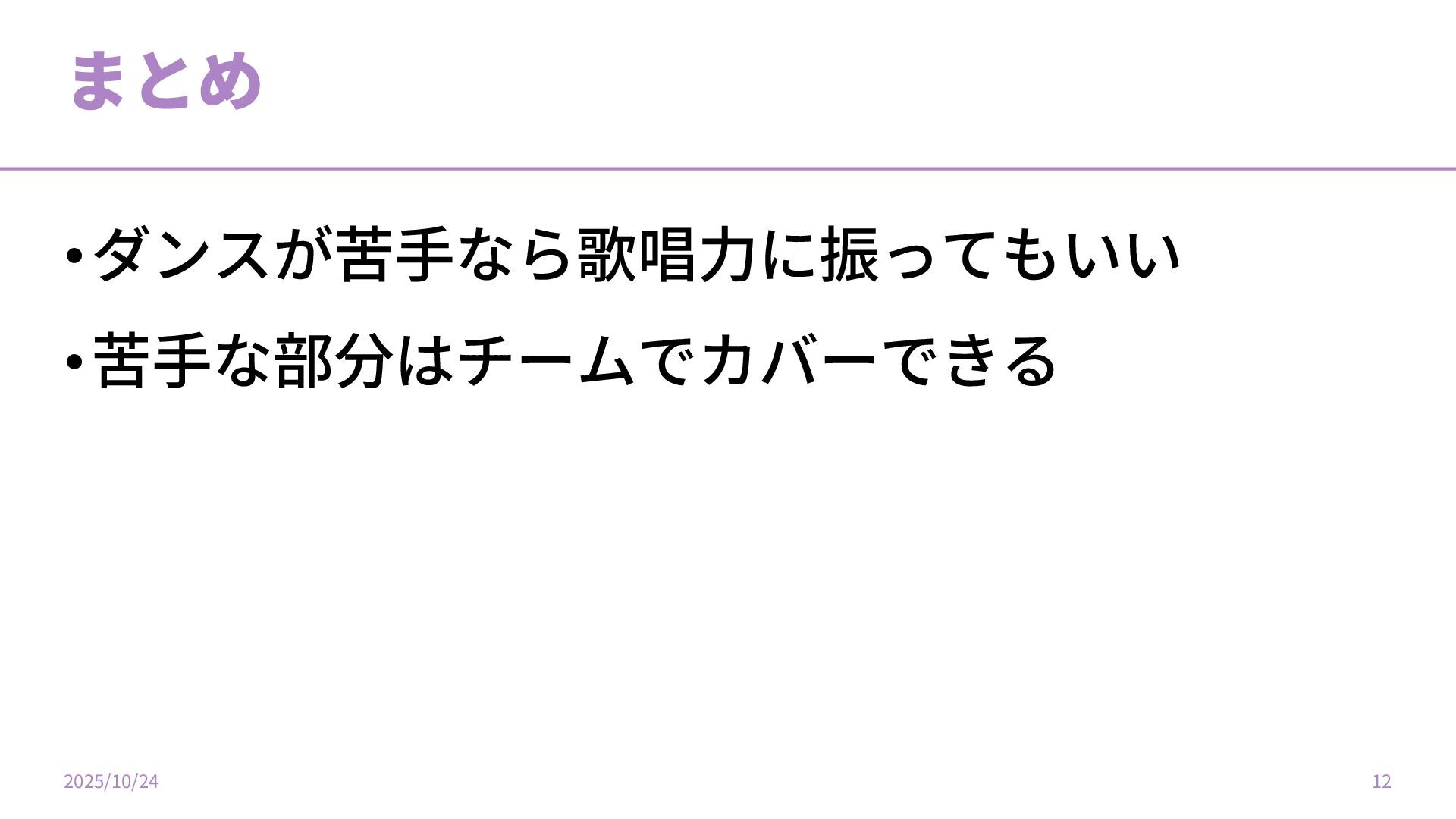 まとめ •ダンスが苦⼿なら歌唱⼒に振ってもいい •苦⼿な部分はチームでカバーできる 2025/10/24 12