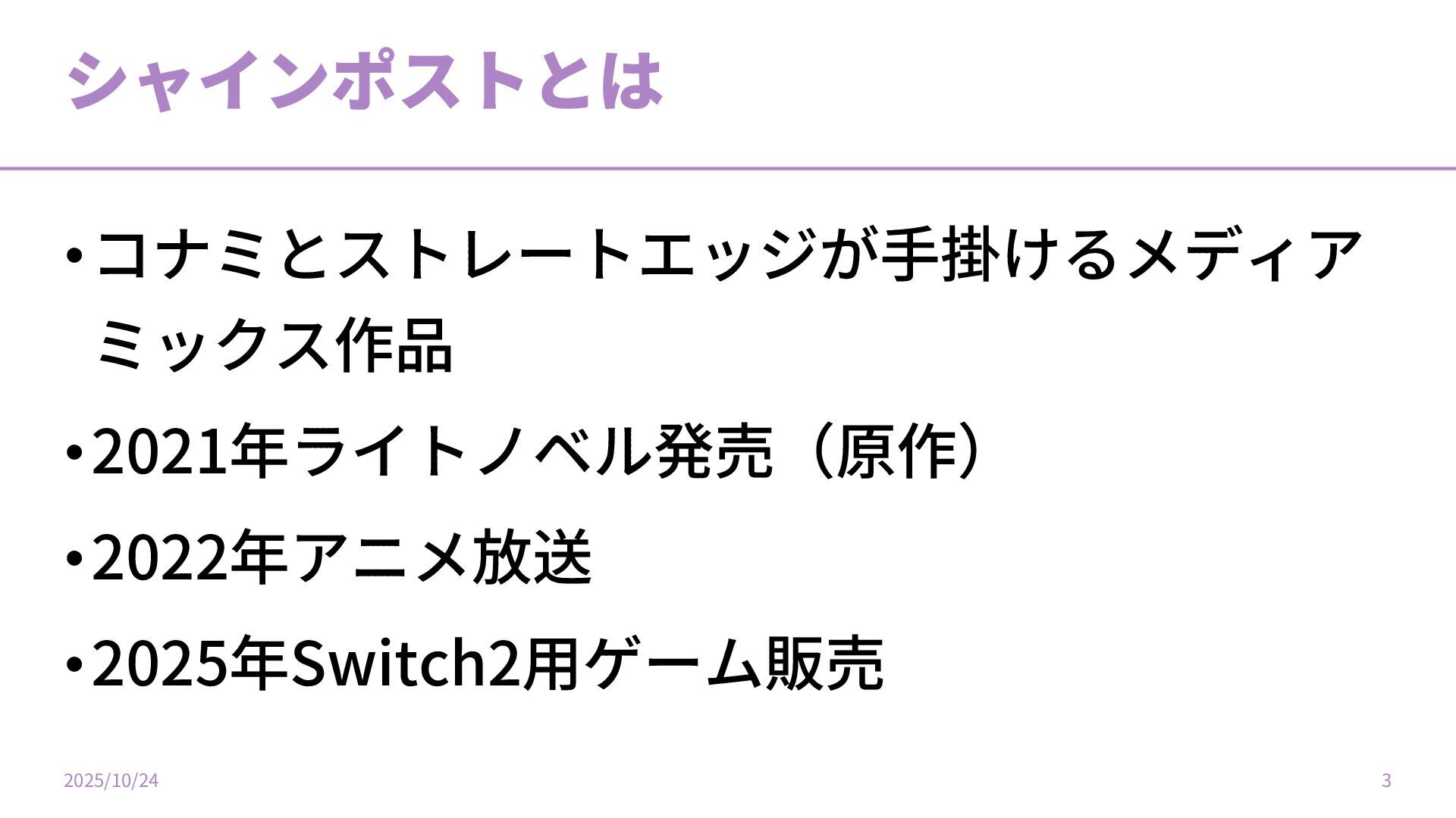 シャインポストとは •コナミとストレートエッジが⼿掛けるメディア ミックス作品 •2021年ライトノベル発売(原作) •2022年アニメ放送 •2025年Switch2⽤ゲーム販売 2025/10/24 3