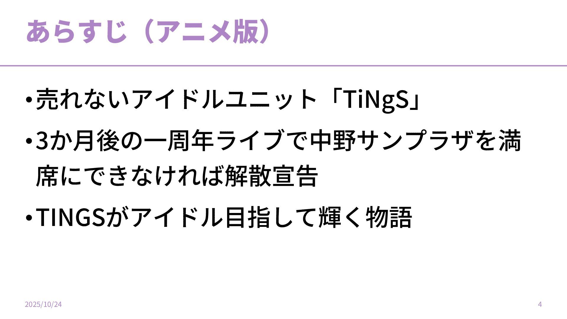 あらすじ(アニメ版) •売れないアイドルユニット「TiNgS」 •3か⽉後の⼀周年ライブで中野サンプラザを満 席にできなければ解散宣告 •TINGSがアイドル⽬指して輝く物語 2025/10/24 4