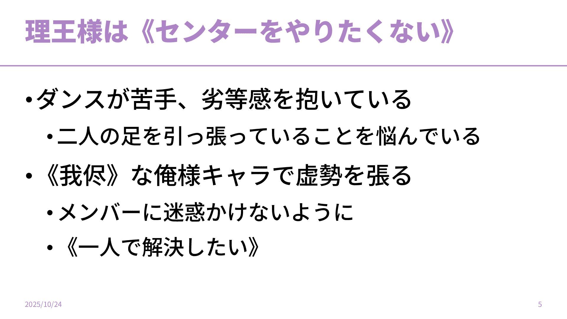 理王様は《センターをやりたくない》 •ダンスが苦⼿、劣等感を抱いている •⼆⼈の⾜を引っ張っていることを悩んでいる •《我侭》な俺様キャラで虚勢を張る •メンバーに迷惑かけないように •《⼀⼈で解決したい》 2025/10/24 5